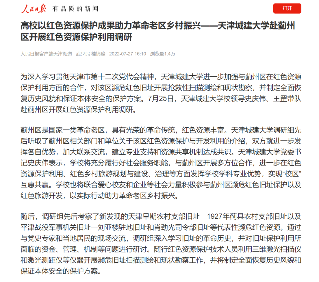 人民日報客戶端以“天津城建大學赴薊州區開展紅色資源保護利用調研”為題對我校工作進行報道