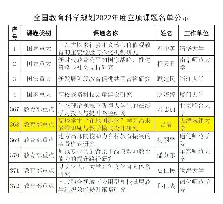 近日,全國教育科學規劃領導小組辦公室公布了2022年度全國教育科學規劃課題立項名單,我校經濟與管理學院教師呂晨申報的《高校學生“在地國際化”學習需求多維識別與教學模式設計研究》獲批立項。此次立項是我校近5年在國家教育科學規劃課題上再次取得的突破。