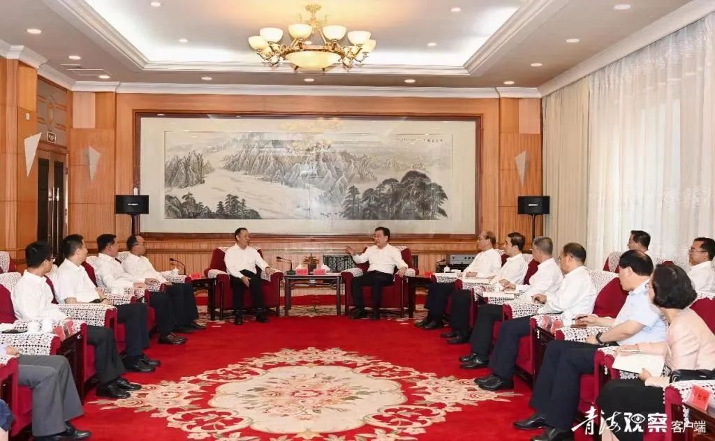 8月4日對口支援青海民族大學10 周年工作會議前,青海省委書記信長星、省長吳曉軍與兩地教育行政部門有關負責同志及各高校負責同志進行親切交流