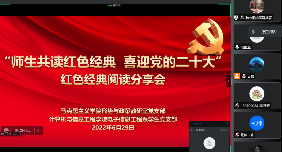 七一前夕,馬克思主義學(xué)院形勢與政策教研室黨支部與計算機與信息工程學(xué)院電子信息工程系學(xué)生黨支部聯(lián)合舉辦“師生共讀紅色經(jīng)典 喜迎黨的二十大”紅色經(jīng)典閱讀分享會,慶祝中國共產(chǎn)黨成立101周年,喜迎黨的二十大勝利召開。會議由形勢與政策教研室黨支部書記劉鵬超主持,師生共29人參加交流研討。