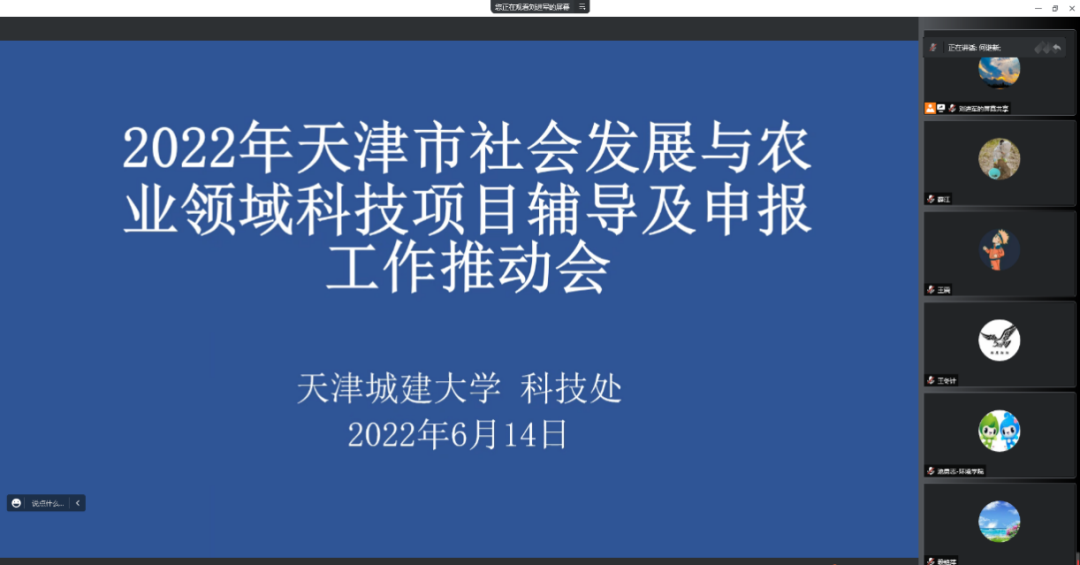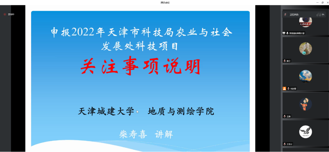 為進一步做好2022年度天津市社會發展與農業領域科技項目申報工作,6月14日,我校通過線上會議方式舉行2022年天津市社會發展與農業領域科技項目輔導及申報工作推動會。本次會議邀請我校地質與測繪學院柴壽喜教授做項目輔導講座,我校教師共計50余人參會。