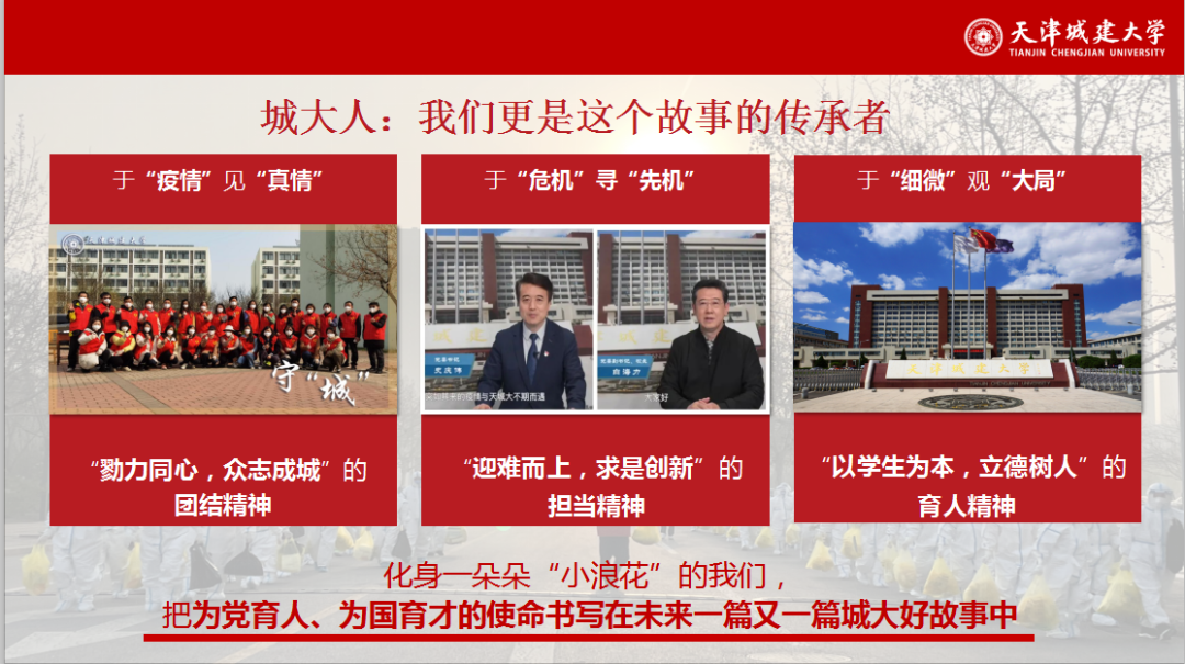 作為城大的一員,我們更是這個(gè)故事的傳承者。我們?cè)跁?shū)寫(xiě)故事、講述故事,也在被故事感動(dòng)和重塑著。于“疫情”見(jiàn)“真情”,我們?cè)诔谴罂挂叩墓适吕锟匆?jiàn)了師生情、同學(xué)情、同事情、校友情共筑起的濃濃的城大情,這是城大人“勠力同心,眾志成城”的團(tuán)結(jié)精神。于“危機(jī)”尋“先機(jī)”,我們把抗疫故事轉(zhuǎn)化成了立德樹(shù)人的育人實(shí)踐,把疫情危機(jī)轉(zhuǎn)化成了學(xué)校科學(xué)治理的先機(jī),這是城大人“迎難而上,求是創(chuàng)新”的擔(dān)當(dāng)精神。于“細(xì)微”觀“大局”,點(diǎn)點(diǎn)動(dòng)人的細(xì)節(jié)皆是早已刻進(jìn)骨子里的“以學(xué)生為中心”在危急時(shí)刻的展現(xiàn),這是城大人“以生為本,立德樹(shù)人”的育人精神。故事終會(huì)成為歷史,而精神必將代代傳承。