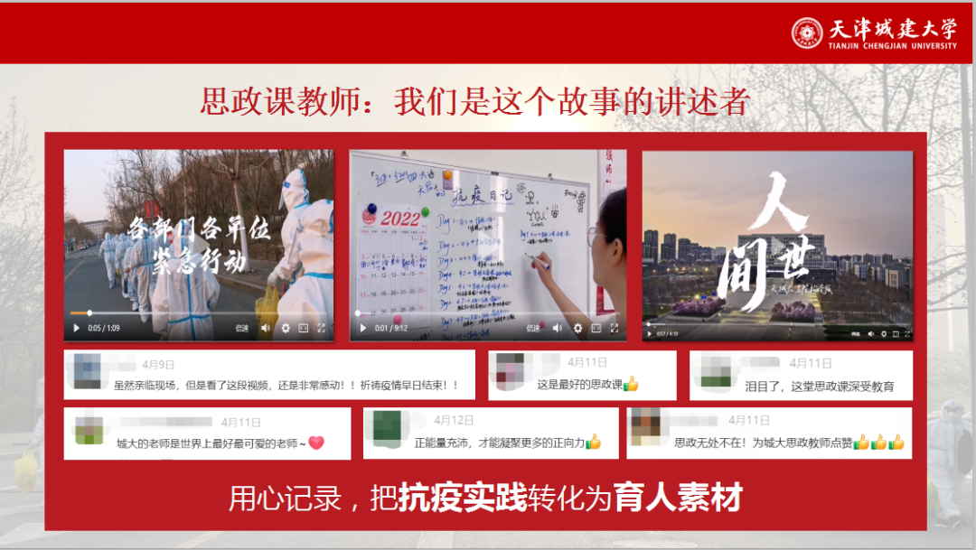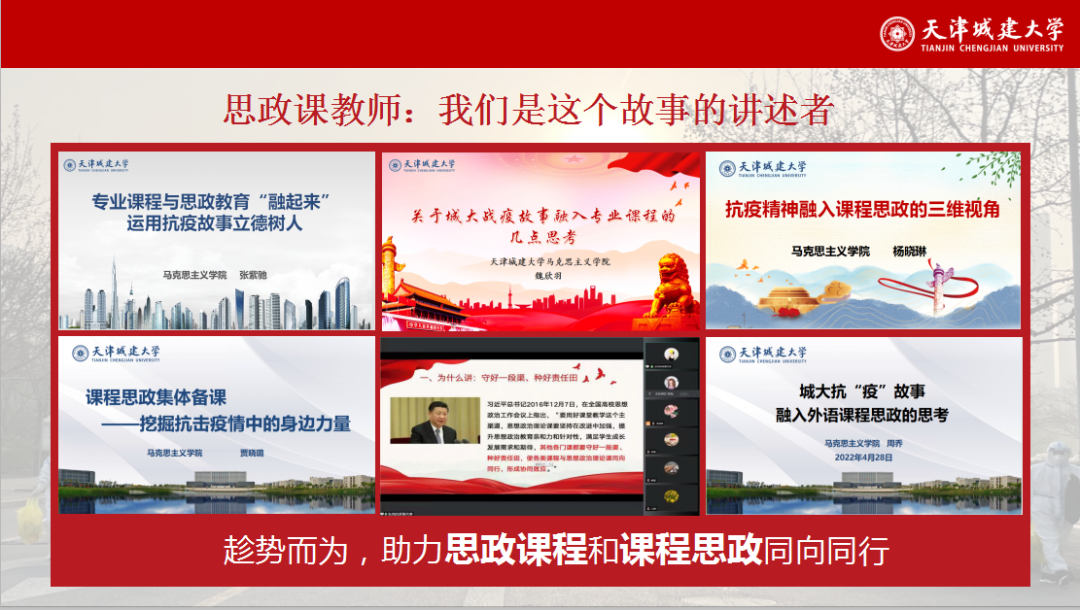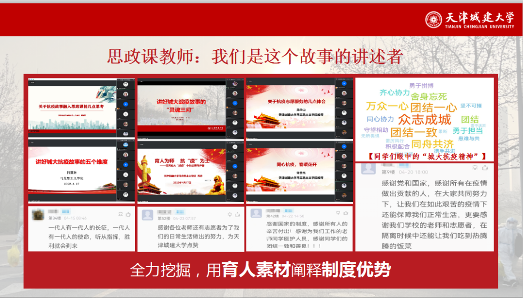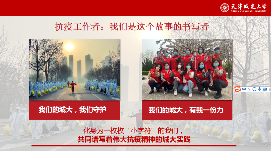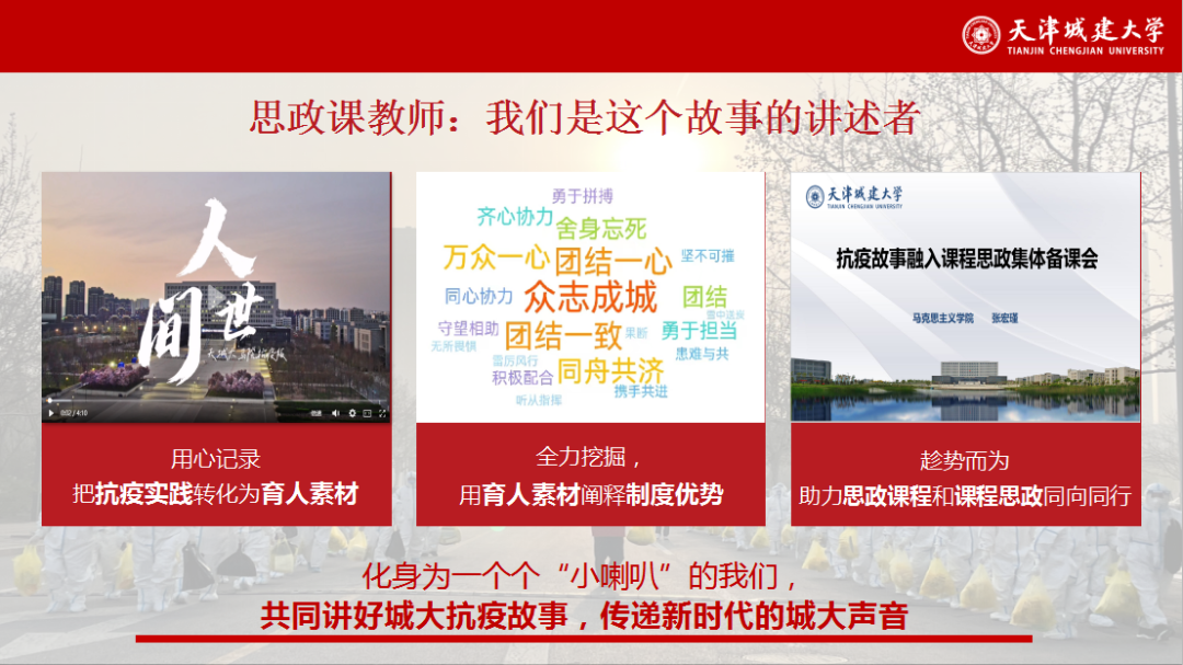 作為思政課教師,我們是這個(gè)故事的講述者。入校工作的十多天,是感動(dòng)和困擾交織的十多天。感動(dòng)于患難之際的師生情、同事情、校友情共筑起的濃濃的城大情;困擾于如何把這份城大情傳遞好,把情中蘊(yùn)含的理講解好,把理中透出的大局闡釋好。 在學(xué)校黨委的堅(jiān)強(qiáng)領(lǐng)導(dǎo)和馬克思主義學(xué)院黨總支的悉心指導(dǎo)下,我們用心記錄,把抗疫實(shí)踐轉(zhuǎn)化為育人素材。一部手機(jī),一臺(tái)電腦,簡(jiǎn)陋的設(shè)備銘記了“疫”中城大的點(diǎn)點(diǎn)滴滴,不太高清的畫(huà)面呈現(xiàn)著一幕幕不辭勞苦,默默前行的執(zhí)著,一句句發(fā)自肺腑、直擊人心的真誠(chéng),這是城大人用行動(dòng)寫(xiě)下的生動(dòng)育人素材。我們?nèi)ν诰颍糜怂夭年U釋制度優(yōu)勢(shì)。一次專題集體備課,十四節(jié)抗“疫”專題思政課,為了講好城大抗“疫”故事,親身參與疫情防控工作的14位思政課教師對(duì)接各學(xué)院,收集資料,共商學(xué)情,根據(jù)不同學(xué)科學(xué)生特點(diǎn),定向挑選育人素材;在歸納總結(jié)素材的基礎(chǔ)上,我們召開(kāi)了專題集體備課會(huì),多視角、多層次、多維度挖掘城大抗疫故事背后蘊(yùn)含的理論邏輯,把故事里的感動(dòng)與課本中的理論融匯貫通,讓抗疫思政課不僅深情,而且深刻。我們趁勢(shì)而為,助力思政課程和課程思政同向同行。一次專題培訓(xùn),十六場(chǎng)課程思政交流會(huì),在學(xué)校的統(tǒng)籌規(guī)劃下,我們迅速與16個(gè)教學(xué)單位結(jié)成了互助小組,依托課程思政分中心,思政課程和課程思政實(shí)現(xiàn)了資料互通、方法互鑒、價(jià)值互證,協(xié)同發(fā)力,共同發(fā)揮好城大抗“疫”實(shí)踐的育人價(jià)值。 努力化身為一個(gè)個(gè)“小喇叭”的我們,用情用理用新招,共同講好城大抗疫故事,傳遞好新時(shí)代的城大聲音。