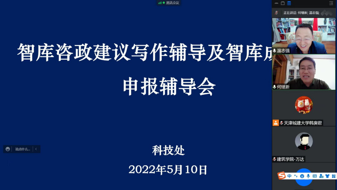 5月10日,為進一步提升我校教師咨政建議的寫作能力,提高我校智庫成果獎申報質量,我校通過線上會議方式舉行咨政建議寫作及智庫成果獎申報輔導會,會議邀請天津市特聘教授,天津師范大學政治與行政學院教授、博士生導師,國家治理研究院副院長溫志強教授作題為“破‘五唯’背景下智庫研究如何實現三個‘影響力’”專題講座。講座由科技處處長何繼新主持。學校各學院科研負責人、智庫負責人和教師150余人參會。