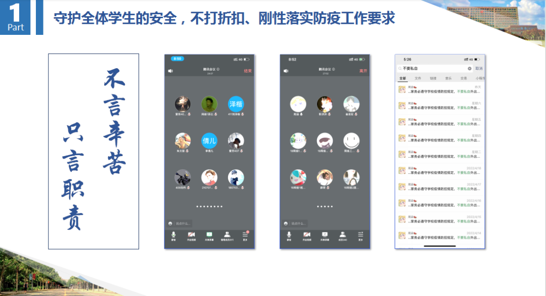 輔導員的責任到底是什么,疫情面前守護全體學生的安全,不打折扣、剛性落實學校的各項防疫工作要求就是我們最大的責任。從返校前的學生信息核查,全體學生的車次信息檢索,再到開學14天每日信息摸排,3月14日以來的同吃同住同學,4月1日的連夜核酸召集、快速抗原檢測,4月2日以來的駐樓守護,30余次核酸檢測組織與臺賬確保不漏一人;10余次全體會議,20余次深入宿舍、無限定次數的溫馨提示,確保讓學校的疫情防控工作要求傳達到每一位同學。在這場工作中,不言辛苦,只言職責。