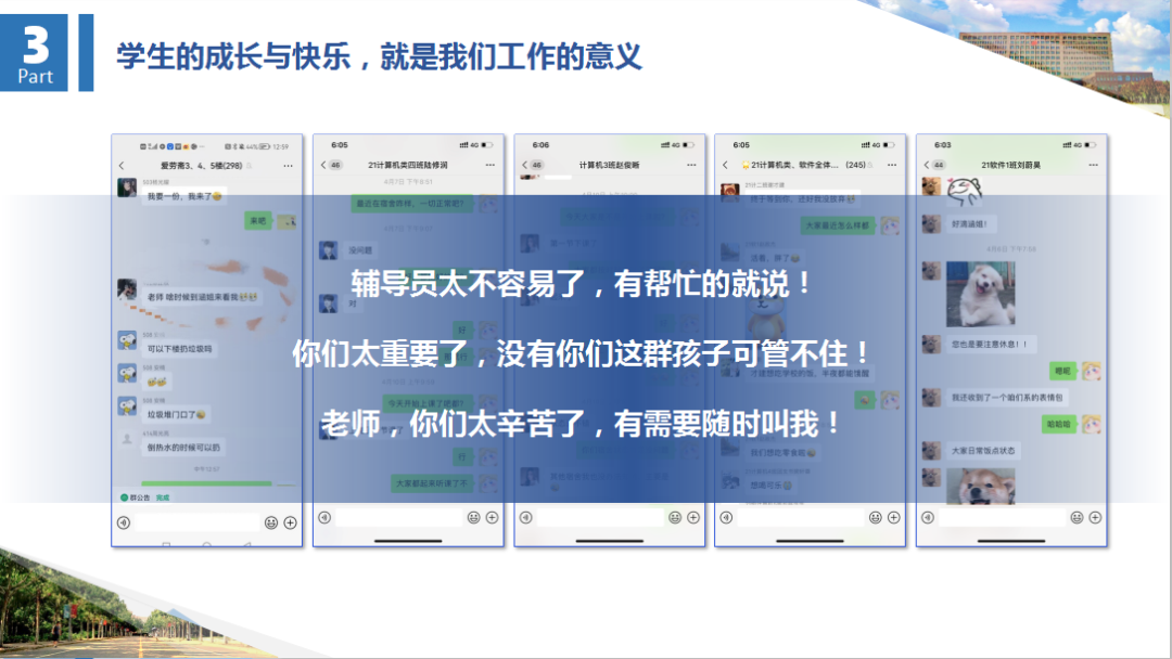 這段時間的工作,辛苦之余更多的是內心的溫暖。樓下宿管師傅說,你們太重要了,沒有你們這群孩子可管不??;抗疫工作者說,輔導員太不容易了;學生說,老師,你們太辛苦了,有需要你隨時叫我。駐樓期間,因為封閉管理,自己無法去愛勞齋看望自己分管的學生,擔心他們因為宿舍條件情緒有波動,心中對他們滿是牽掛。有學生在群里問,涵姐什么時候來看我們?班長發信息說:老師,班上同學都很好,你注意安全。所有的辛苦,在看到學生的成長面前,不值一提。感謝所有的領導,老師,學生對輔導員隊伍的指導、幫助與配合,在這場戰疫中,沒有什么應該不應該,一切都是職責所在,滿足學生的需求,確保他們安全,給予他們成長與快樂,就是我們工作的意義。