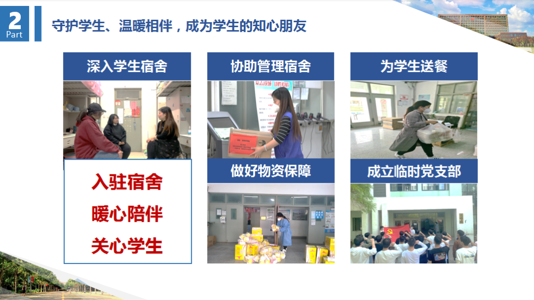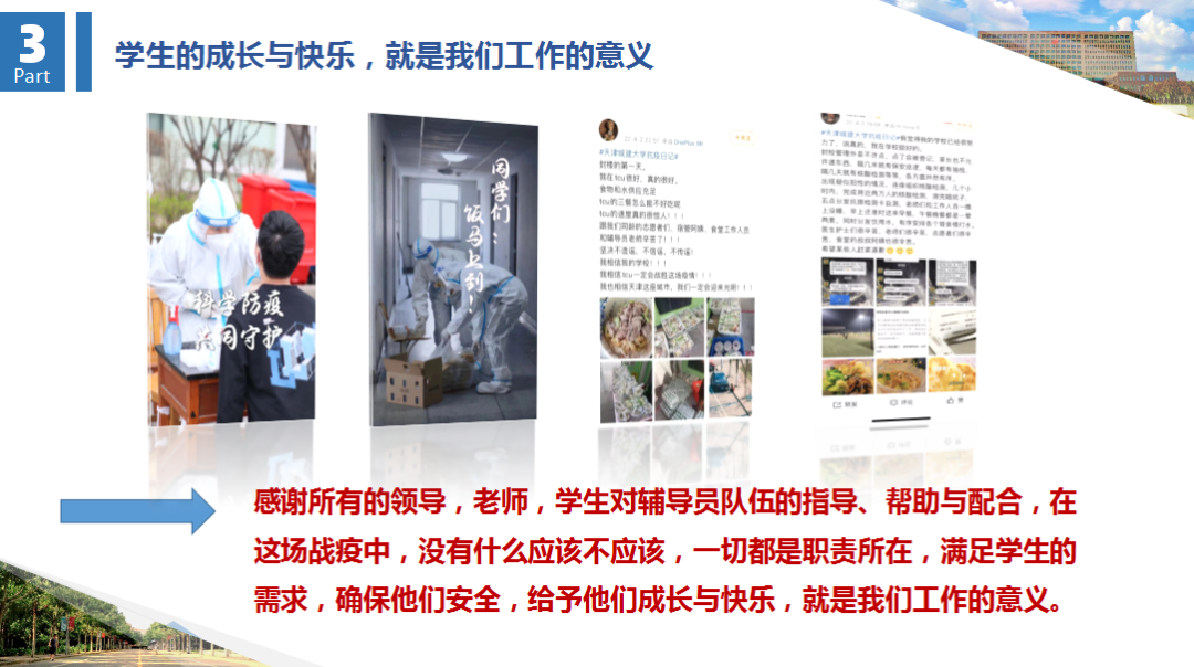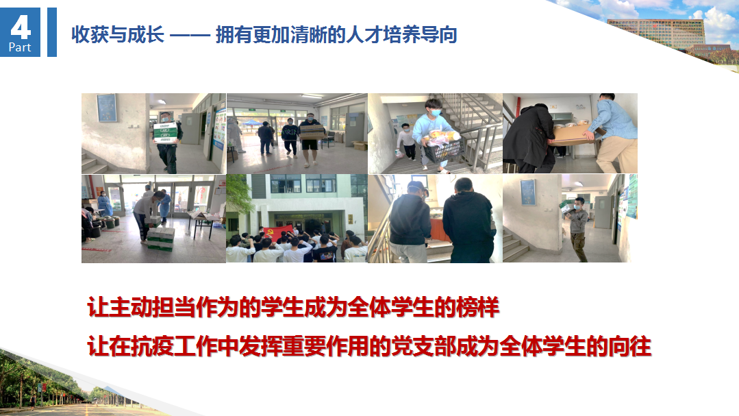 我們擁有了與學生更加貼心的距離。通過這次抗疫經歷,我們更加清晰的認識到輔導員的一切工作都是基于對學生實際需求的把握,所有事務的順利開展都是依靠雙方的理解與信任,學生有需求能不能想到我們,有心理波動,能不能反饋給我們,輔導員說的話,學生能不能記到心里,是我們要持續思考的問題,擁有駐樓經歷的我們對學生宿舍狀態、生活習慣、日常表現有了更加深入的了解,學生對于輔導員的工作性質有了全新的認識,為我們日后的思政工作提供了更加有力的支持。我們擁有了更加強大的育人能力。宿舍、食堂、教室、操場都是輔導員工作的戰場,線上鍵對鍵,線下面對面,都是我們育人的方式,專業教師、家長、宿舍樓管、樓層長都是我們育人的幫手,進一步拓寬的育人渠道,為我們三全育人工作提供了新的思路。我們擁有了更加清晰的人才培養導向。習近平總書記多次強調,要時刻牢記:為誰培養人、培養什么人、怎樣培養人這個根本問題。這場疫情防控工作中,許多學生主動站出來維護學校的聲譽、自覺投身疫情防控志愿服務,他們的表現已經給了我們明確答案,我們要培養的就是關鍵時刻沖的上去,危難時刻頂的上來,經得住風險考驗的學生。我們要努力讓主動擔當作為的學生成為全體學生的榜樣,讓在抗疫工作中發揮重要作用的黨支部成為全體學生的向往。