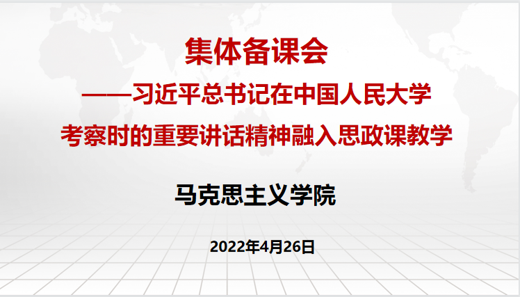4月25日,習近平總書記在中國人民大學考察調研時,觀摩思政課智慧教室現場教學、參與課堂討論、參觀博物館,并就思政課建設發表重要講話。4月26日,馬克思主義學院舉辦線上集體備課會,就如何將習近平總書記在中國人民大學考察調研時的重要講話精神融入思政課教學展開備課研討。