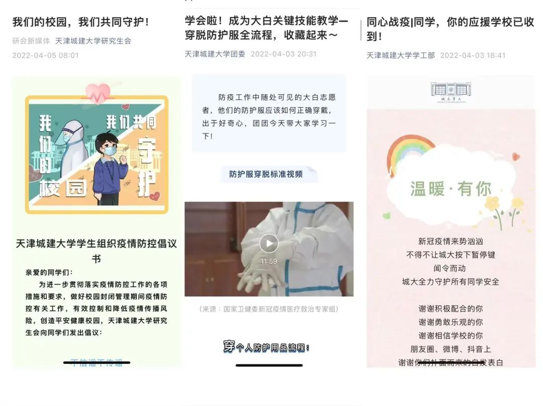 制定《校外學生管理工作方案》,建立由輔導員、思政組教師組成的專項工作群,思政組教師包干負責相應區域學生管理,進入相應學生群。聯合基層學院與學生“一對一”取得聯系,了解學生思想動態、生活需求、學習困難等情況,第一時間掌握并給予及時解決。制作新媒體推送,及時宣傳防疫知識。