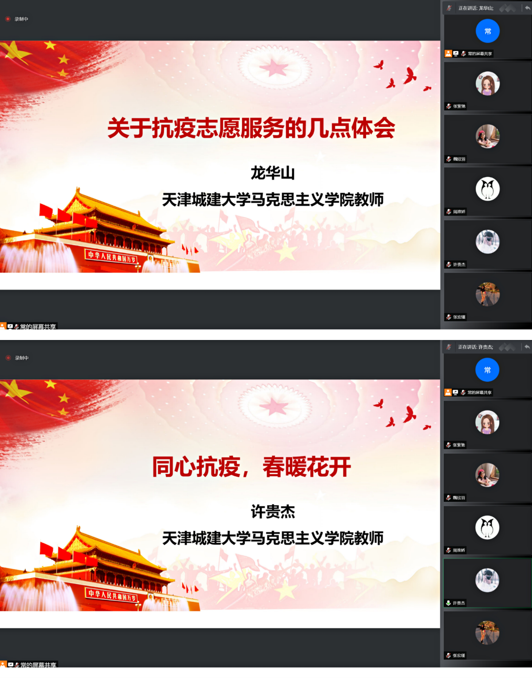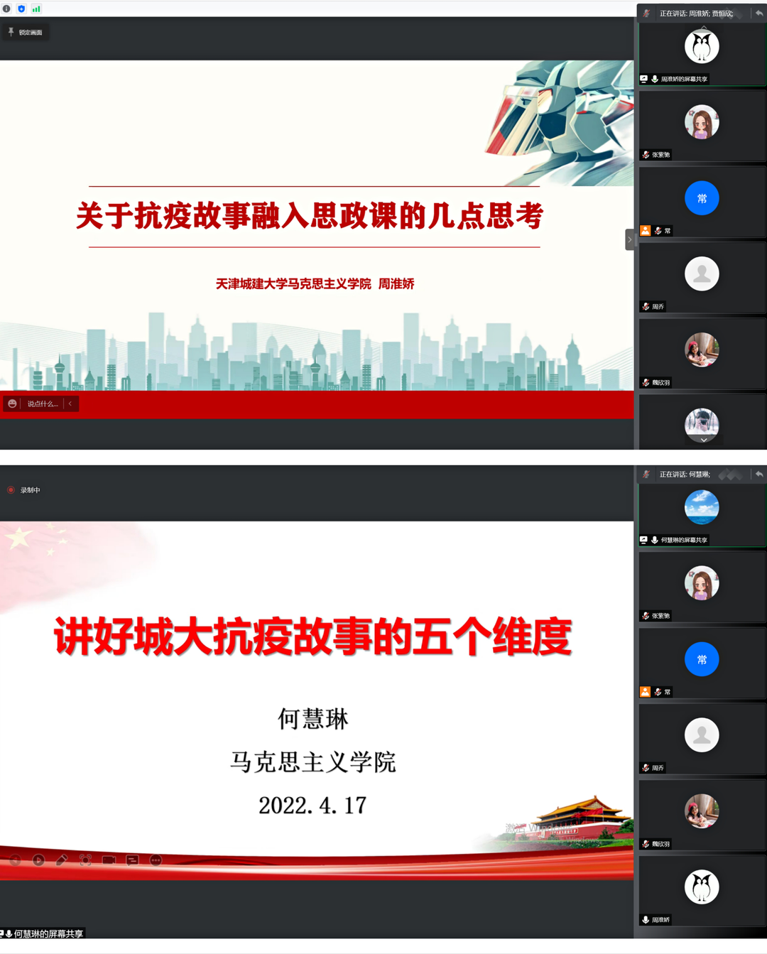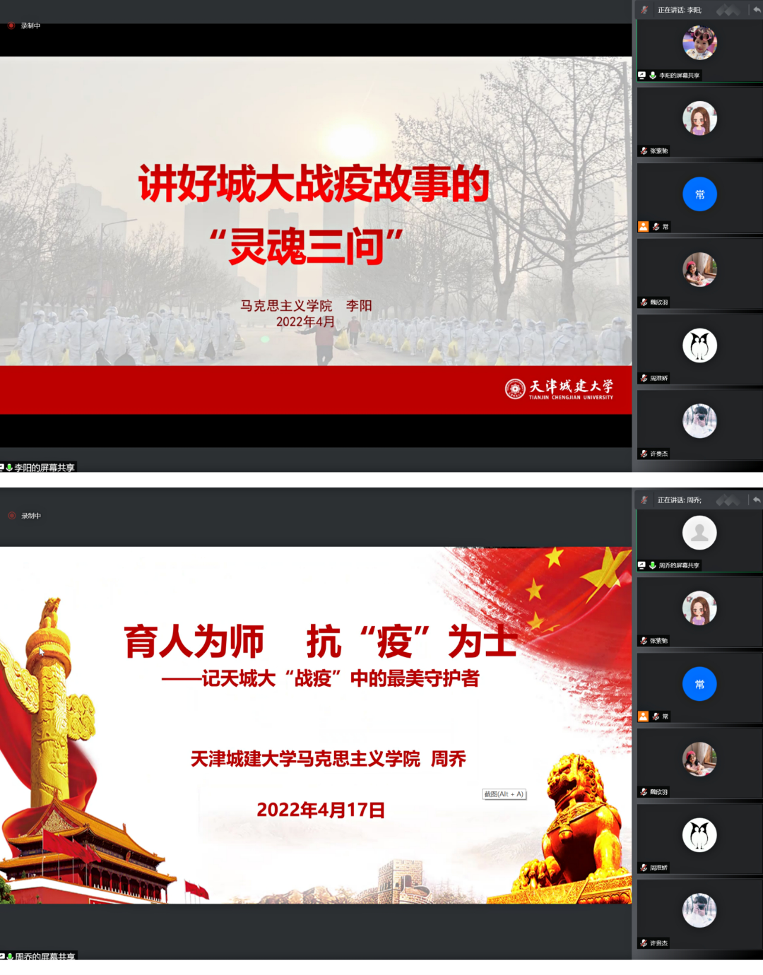 為講好城大抗疫故事,打造城大特色抗疫思政課,4月17日,馬克思主義學院舉辦線上抗疫志愿活動交流會暨抗疫案例融入思政課集體備課會。學院黨總支書記高燕、院長張廣森參加會議,副院長賈恒欣主持會議,第一批入校的17名教師志愿者參加了會議。