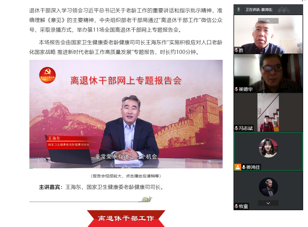 老同志們紛紛表示,本場專題報告會主題鮮明,內容豐富,貼近老同志,受益匪淺,很有意義。對深入學習貫徹習近平總書記關于積極應對人口老齡化的重要指示精神,準確理解國家戰略部署幫助很大。老同志們動情地談到,黨的十八大以來,以習近平同志為核心的黨中央高度重視老齡工作,在不斷滿足老年人多層次且多樣化的需求,解決老年人在社會保障、養老、醫療等民生問題上的“急難愁盼”,黨和國家做了大量基礎性工作,是下了大氣力的,讓我們老年人共享改革發展成果,我們內心感到無比幸福,這也更加激發了我們“老有所為”的內在動力,我們要深刻理解和踐行積極老齡觀,以實際行動把健康老齡化理念融入到社會發展之中,充分發揮余熱,身體力行地發揮好高校退休干部應有的作用,以實際行動迎接黨的二十大勝利召開。還有很多老同志居家自學,認真做筆記,報告會結束后在微信群中進行交流,紛紛發表了自己的感想。