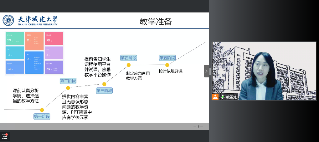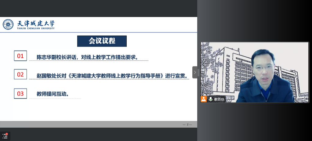 教務處處長趙國敏對《天津城建大學教師線上教學行為指導手冊》進行宣貫。從總體要求、教學準備、教學過程、反思與教學考核四個方面對教師線上教學行為指導手冊進行了全方位的解讀,并為教師進行了系統性的線上教學行為指導。教務處相關工作負責人針對任課教師提出的問題進行了解答。