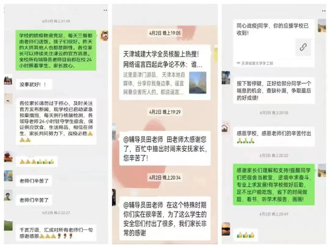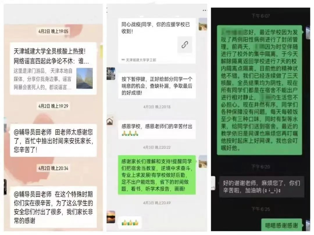 “家長,您擔心的問題學校均已安排妥當,請您放心!”疫情發生以后,工作組接到大量家長的焦慮詢問,為讓家長放心,各學院迅速公布咨詢電話,24小時接受家長咨詢;多途徑廣泛轉發反映學校工作狀態的推文;不厭其煩的向線上和電話詢問的家長介紹學校的抗疫工作;根據工作需要,主動聯系部分學生家長,詳細介紹情況、安慰情緒、形成合力。得知孩子們在校一切都好,家長們紛紛表示理解和支持。