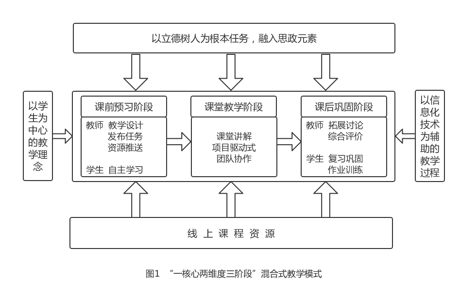 本課程線上教學基于“一核心兩維度三階段”混合式教學模式開展,如圖所示。課程組以立德樹人為根本任務,圍繞課程主要內容積極挖掘了相關思政元素。兩個維度貫穿始終,即以學生為中心的教育理念和信息化技術融入教育教學。三階段即課前預習階段、課堂教學階段和課后鞏固階段,三個階段完整地支撐了教學全過程。線上課程資源的建設是混合式教學的基礎,課程組采用選用和自建相結合的方式,建立了大量優(yōu)質且符合我校定位和學生特點的教學資源。