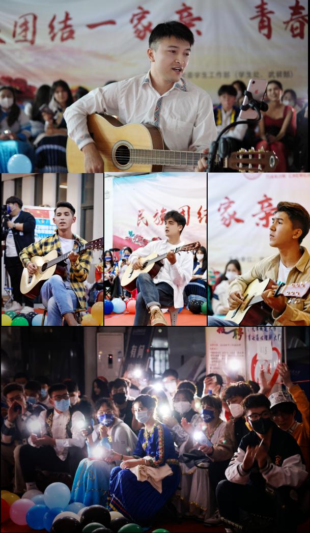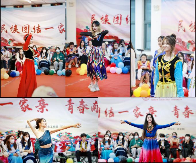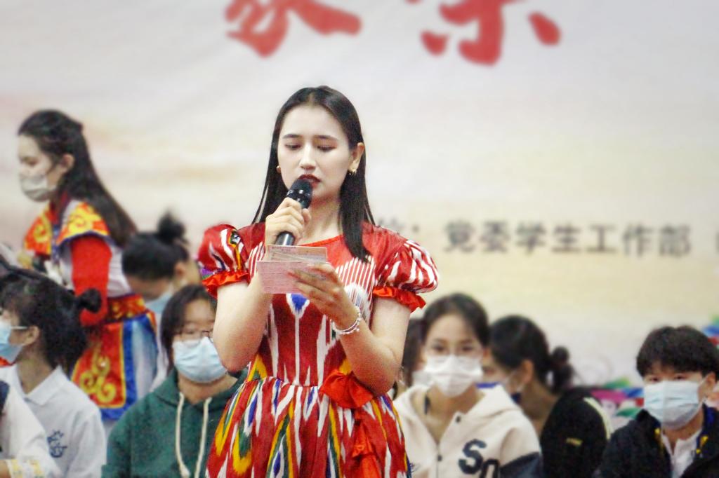 活動現場,民族歌曲悠揚,民族舞蹈飄逸。開場在一曲旋律激昂的《你要跳舞嗎》中拉開序幕,點燃歡唱之旅。優美的曲子,曼妙的舞姿,極具新疆風情的舞蹈《舞新疆》《小花帽》《舞韻民風,源源而來》《石榴花開》等舞蹈,為在場師生帶來一種能歌善舞的美、一種源遠流長的美、一種團結奮進的美。