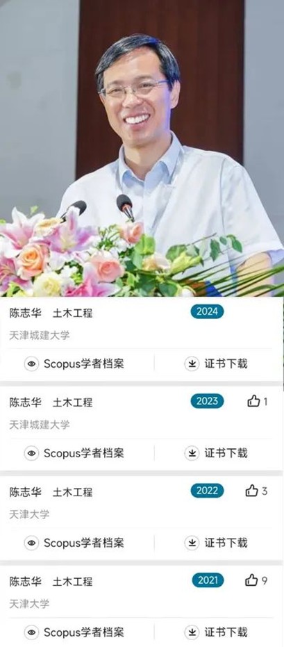 陳志華教授2021年-2024年連續4年被全球性信息分析公司愛思唯爾(Elsevier)評為中國高被引學者。經Scopus數據庫查證,自2020年至今,近5年發表成果數量達262篇,成果被引用次數累計達6527次,學術成果被引次數自2020年至2024年連續穩步攀升,相關學術成果的行業認可度日益提高。在近5年的高被引學術成果中,單篇過百次被引論文總計11篇,其中最高被引論文《Experimental study on interior connections in modular steel buildings》被引次數達247次。截至當前,Scopus數據庫已收錄陳志華教授614篇文章,被4686篇文獻引用。