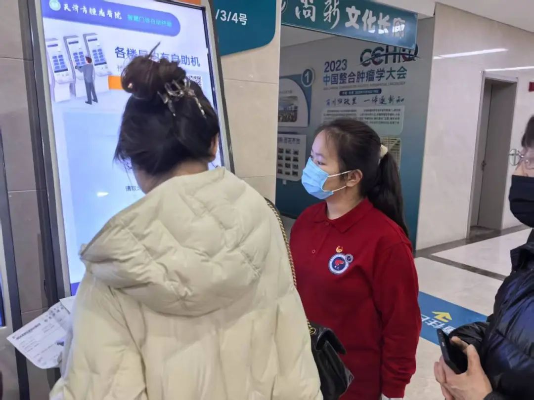 為了踐行醫療為民服務理念,薪火班學員赴天津市河西區腫瘤醫院,化身“就醫助手”,為患者提供貼心服務。在就診部,張羽昊、丁偉積極協助患者操作自助機器完成掛號、繳費等流程,并帶領迷路的患者去往就醫科室。面對患者們問題,他們始終面帶微笑,耐心細致地一一解答,用溫暖的話語驅散患者心中的迷茫?!靶』鹈纭眰兇┧笤卺t院的各個角落,為患者提供精準的引導和全方位的幫助,讓患者在就醫過程中感受到前所未有的便捷與高效,在寒冷的冬日里為他們送去了一縷溫暖的陽光。