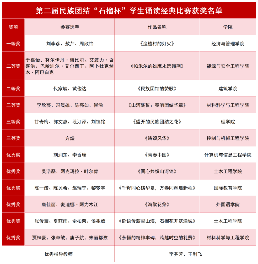 本次比賽緊緊抓住鑄牢中華民族共同體意識這條主線,聚焦深化民族團結進步教育,形成了以賽促學的良好學習氛圍。學校將以此次活動為契機,進一步深化對習近平總書記關于加強和改進民族工作的重要思想的理解和把握,不斷拓寬鑄牢中華民族共同體意識教育的實施路徑,通過“石榴樹”培根計劃、“石榴花開”研學體系、“石榴籽”融合項目、“紅石榴”鑄魂工程等品牌項目的深入推進,夯實協同育人工作機制,不斷提升各民族師生的獲得感、幸福感、成就感,引導廣大師生牢固樹立休戚與共、榮辱與共、生死與共、命運與共的共同體理念,營造中華民族一家親的濃厚氛圍