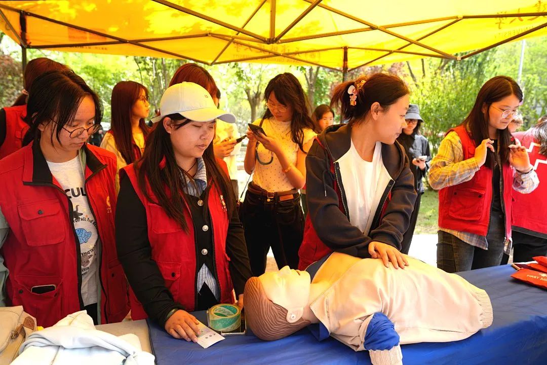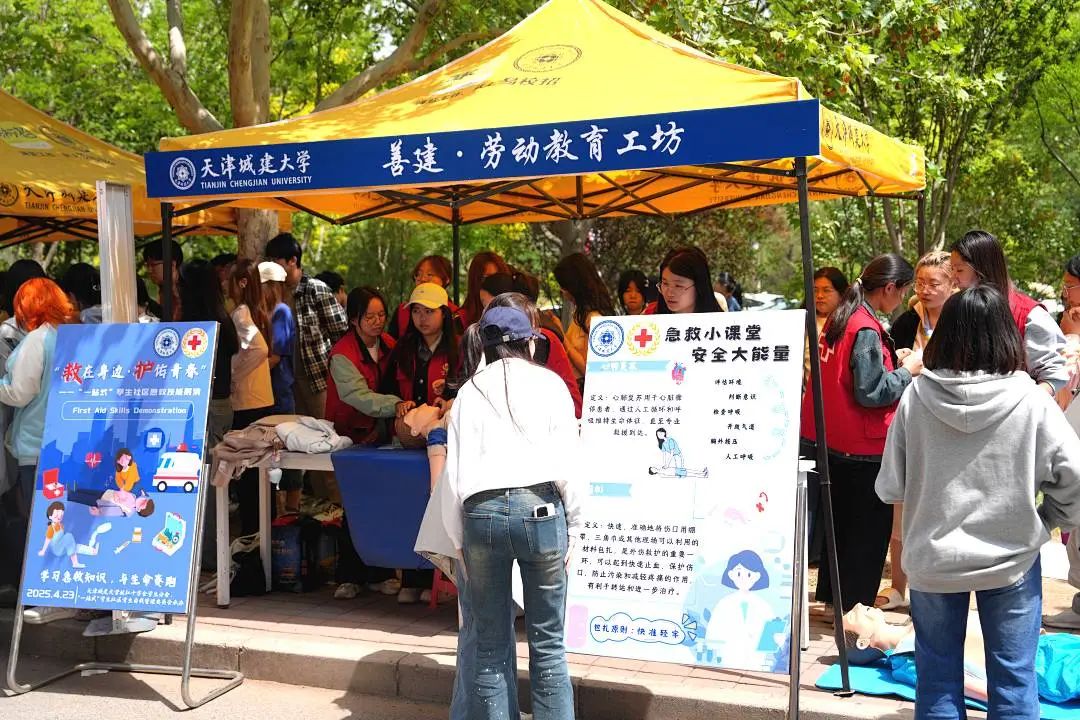 黨委學工部“善建”勞動工坊組織“救在身邊·護佑青春”——“一站式”學生社區急救技能展演,20名學生現場模擬心肺復蘇與情景救援,強化校園應急能力。