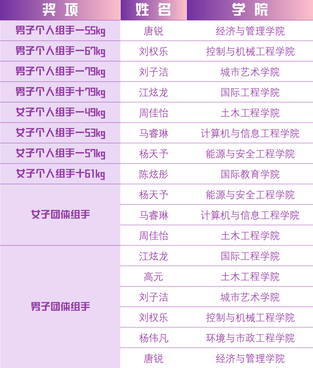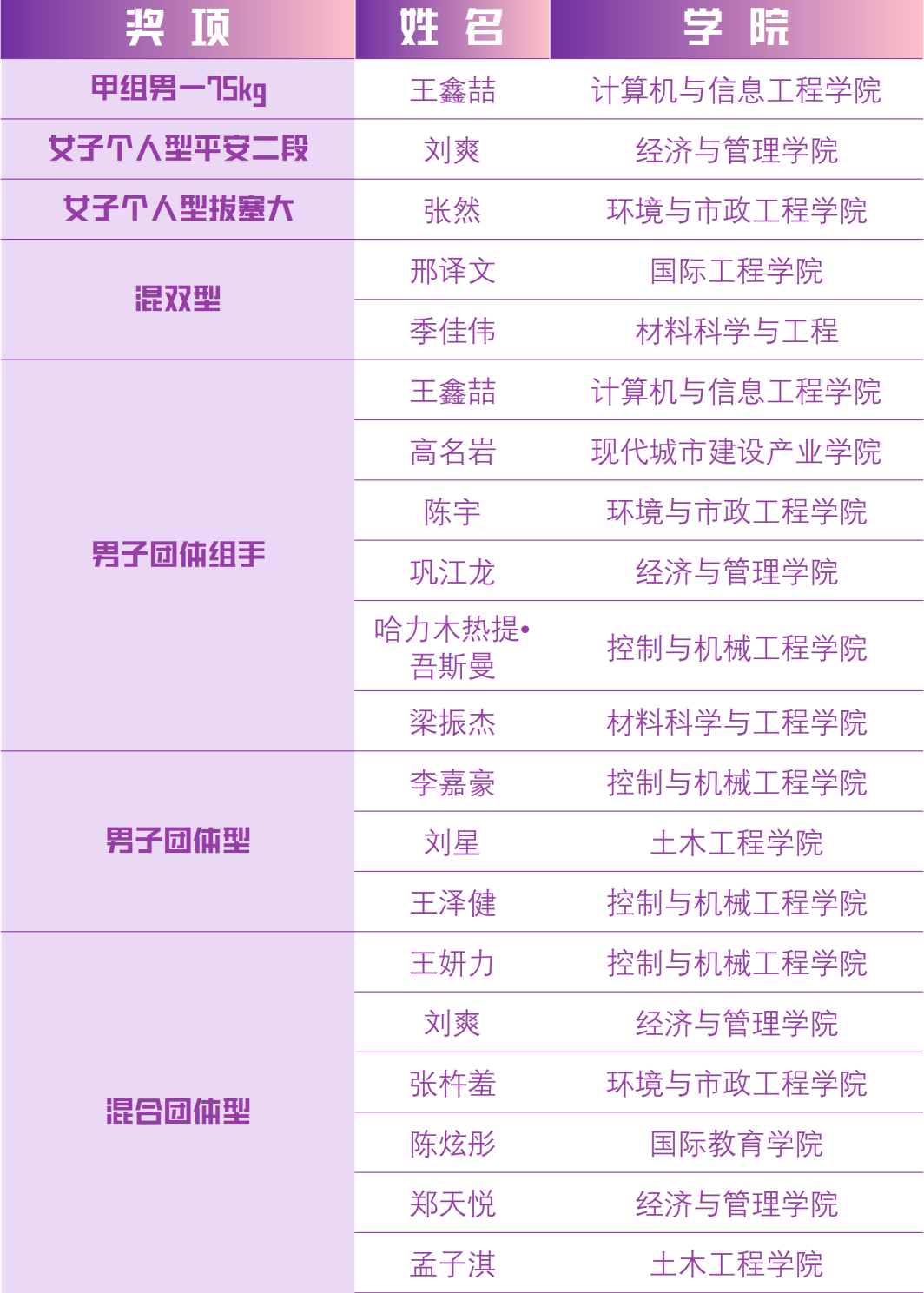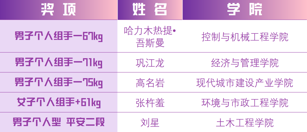 本次比賽,我校共派出34名運動員參賽,健兒們經過頑強拼搏,斬獲10金、5銀、7銅和團體總分第一名的優異成績,充分彰顯了“重德重能 善學善建”的校訓精神,展現了我校開展新時代體育建設和推動體教融合的重要成果,體現了天城大學子昂揚向上的青春風貌。
