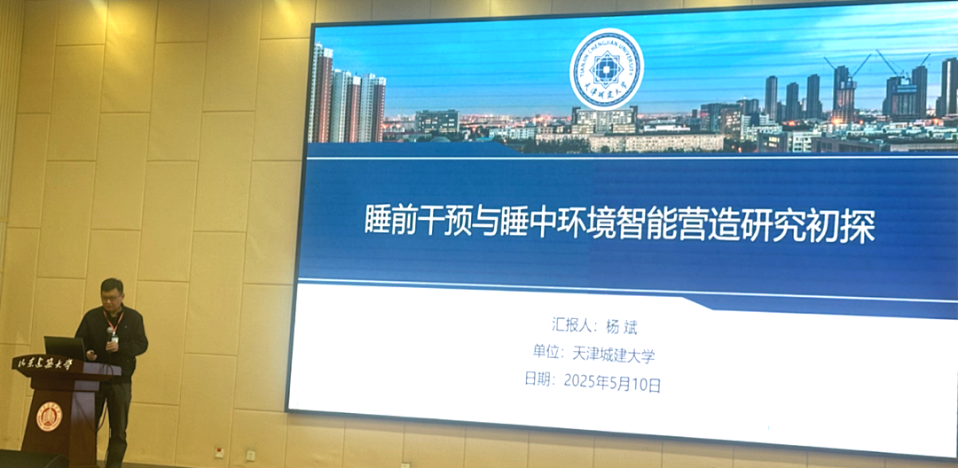 楊斌教授在大會主論壇受邀作題為《睡前干預與睡中環境智能營造硏究初探》的專家學術報告。報告介紹了課題組在睡前干預和睡中環境智能營造兩方面的相關研究結果。他表示足浴和睡前使用手機會影響青年人群的睡眠質量,通過機器視覺實時非接觸感知睡眠熱感覺,并將睡眠熱感覺引入臥室空調自控過程,可以實現復雜場景下每臺空調設備所管轄區域的睡眠熱感覺整體預測和評價,以及空調系統的智能化調控。
