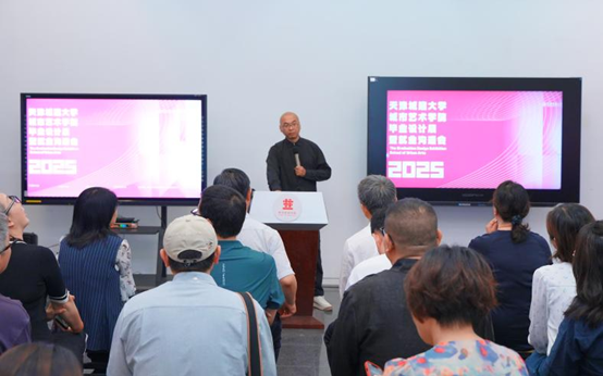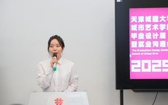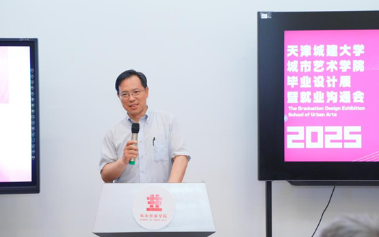 陳志華對本次畢業設計展開幕表示熱烈的祝賀,充分肯定了此次畢業設計展暨就業溝通會的特色活動和精彩亮點。他表示,城市藝術學院作為學校開展藝術教育的重要陣地,在此次畢業設計教育教學工作中取得了突出的亮點和成果,一是畢業生們充分發揮專業特色,展現出卓越的學科交叉與跨界融合的創新能力;二是畢業設計的教學過程緊密追蹤科技革命與產業變革的浪潮,成功引導學生將前沿的探索精神融入設計實踐;三是產教融合、協同育人的培養模式讓畢業生的設計作品成為能夠在市場與行業中接受檢驗的“準產品”。最后,他宣布天津城建大學城市藝術學院2025年畢業設計展暨就業溝通會正式開幕。