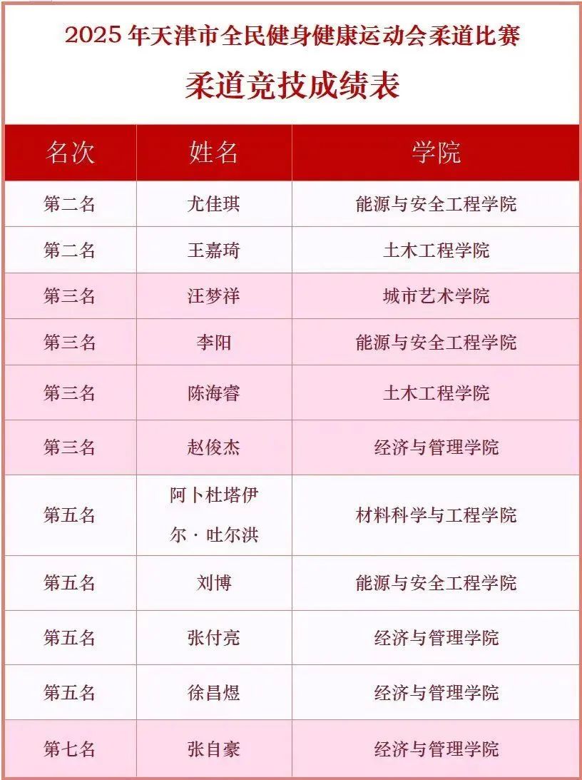 在天津市“體彩杯”全民健身健康運動會柔道比賽的賽場上,我校14名隊員同樣展現了頑強的拼搏精神。面對來自全市20余支代表隊的500余名運動員,我校健兒沉著應戰,最終勇奪2枚銀牌、4枚銅牌、4個第五名和1個第七名的佳績。