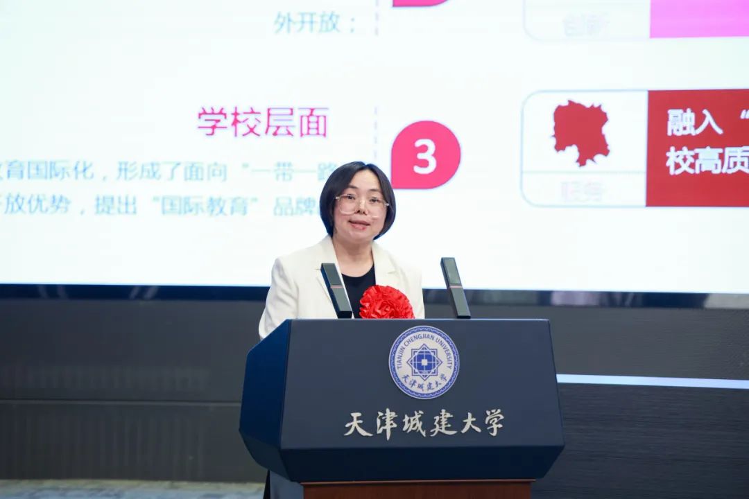 先進基層黨組織榮譽稱號獲得單位、國際工程學院黨總支書記楊萍作為二級黨組織書記代表,講述了自己認真履行黨建第一責任人職責,班子成員團結協作、勇于擔當、積極作為,推動中外合作辦學事業蓬勃發展,以“國工行動”奮力譜寫“天城大”教育國際化嶄新篇章的生動故事。