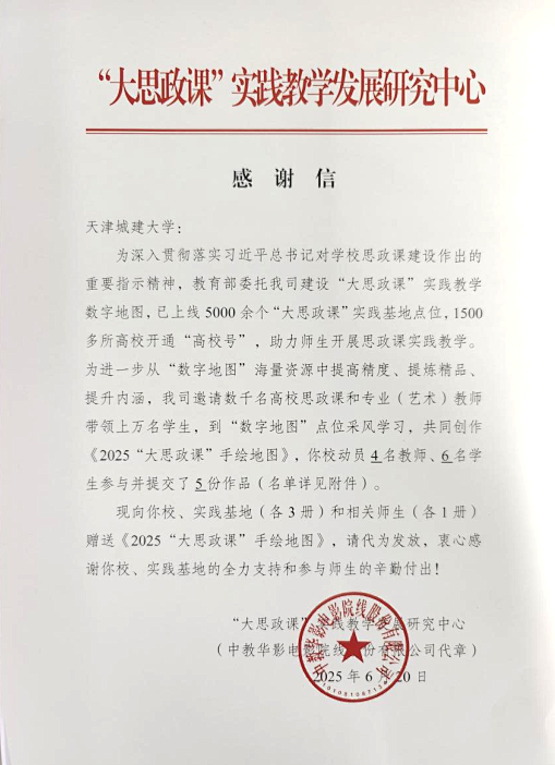 近日,“大思政課”實踐教學發展研究中心向我校發來感謝信,對我校在《2025年“大思政課”手繪地圖》工作中的全力支持與積極參與表示衷心感謝。