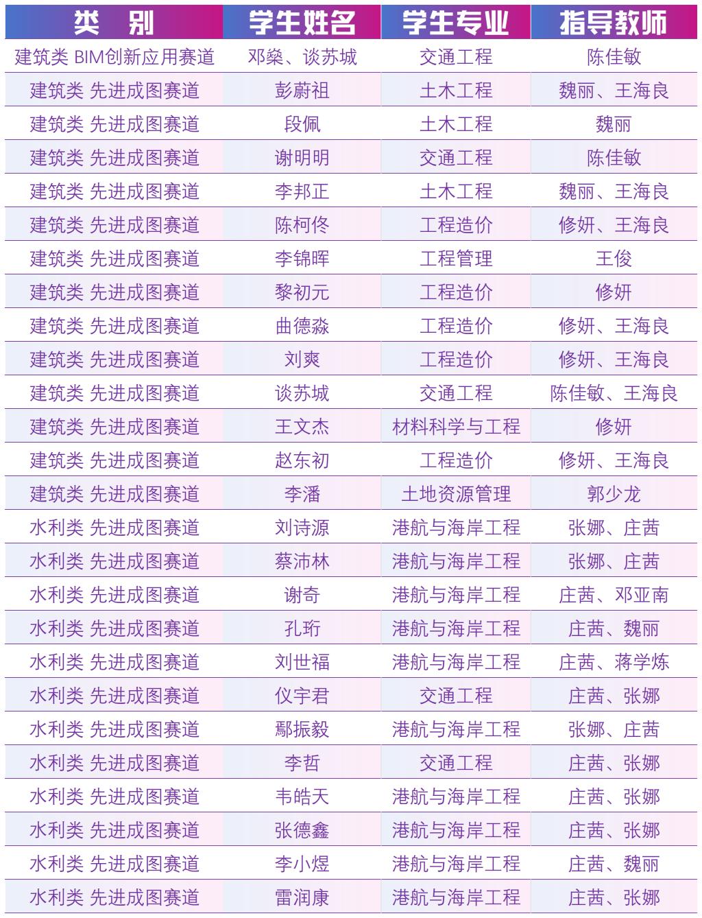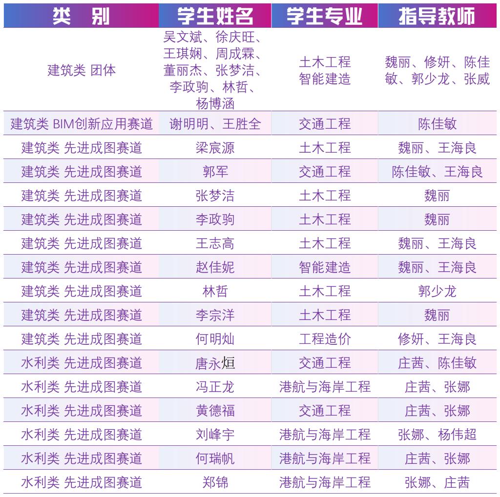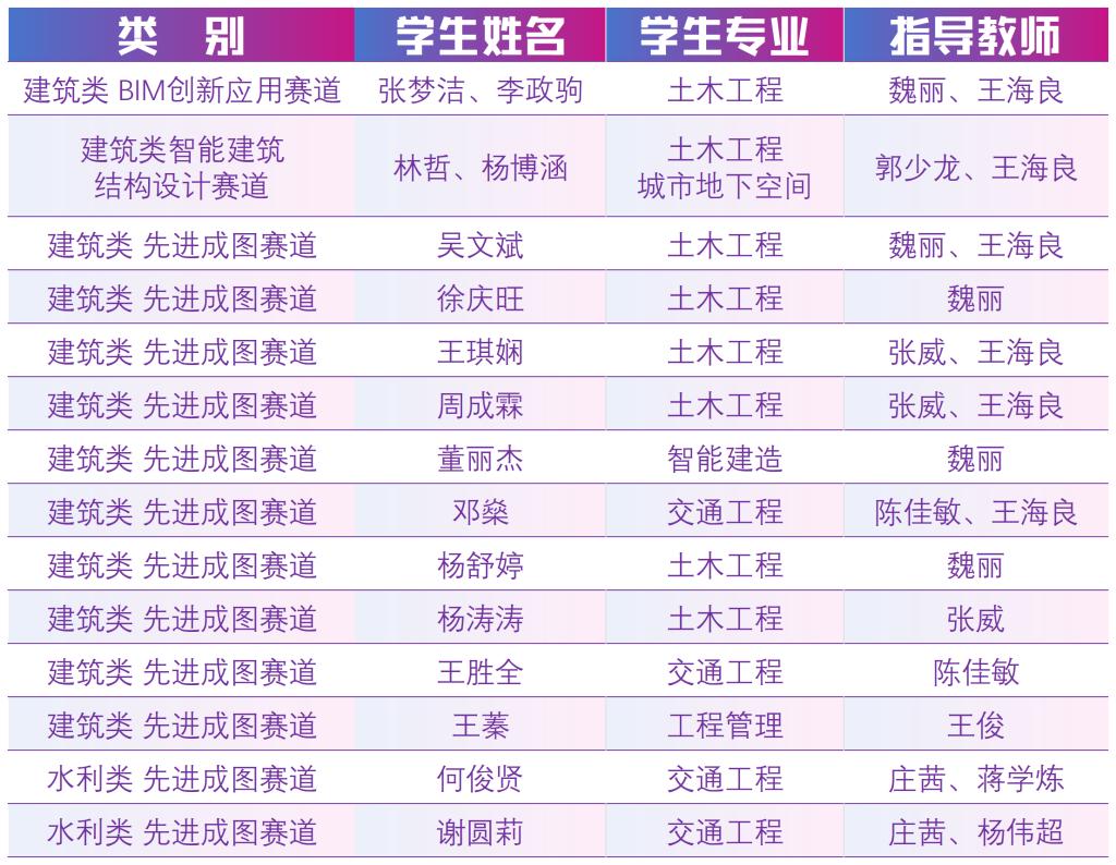 我校師生分別榮獲建筑類團體二等獎;“建筑類BIM創新應用賽道”一等獎、二等獎、三等獎各1項;智能建筑結構設計賽道一等獎1項;“建筑類先進成圖賽道”一等獎10項、二等獎9項、三等獎13項;“水利類先進成圖賽道”一等獎2項、二等獎6項、三等獎12項等多個獎項,另有9名老師獲得優秀指導教師獎。獲獎名單如下: