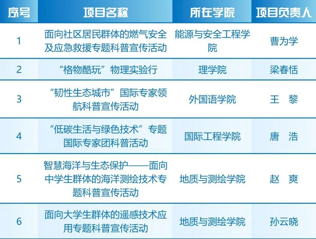 此次獲批的項目涵蓋了能源安全、生態城市、綠色低碳、海洋測繪及遙感技術、物理學等多個研究領域,體現了學校在不同領域的科研優勢和科普潛力。此次獲批的2項外國專家科普活動專題項目邀請了我校國際工程學院的多位國外教授共同開展科普活動,充分體現了學校國際辦學優勢。這些項目將圍繞燃氣安全及應急救援、韌性生態城市、低碳生活與綠色技術、智慧海洋與生態保護、遙感技術應用、物理實驗教學等學科方向展開,旨在通過科普活動、展覽展示、科普作品創作等多種形式,向公眾普及科學知識,提升公眾科學素養。學校將充分發揮自身學科優勢和科研力量,精心組織項目實施,確保項目取得預期成效。