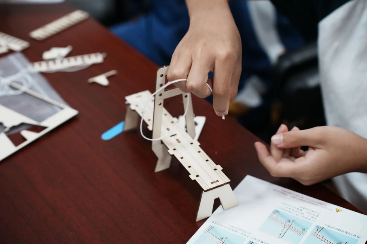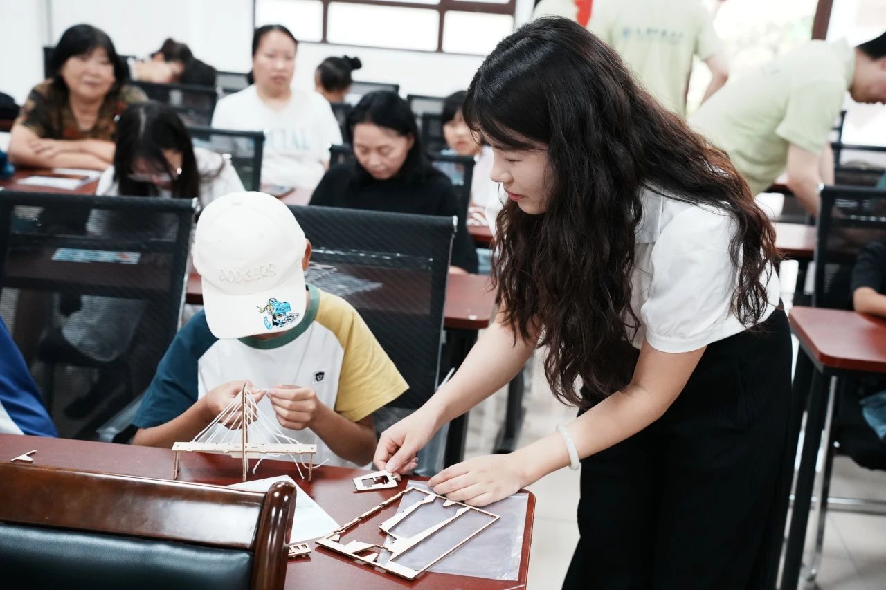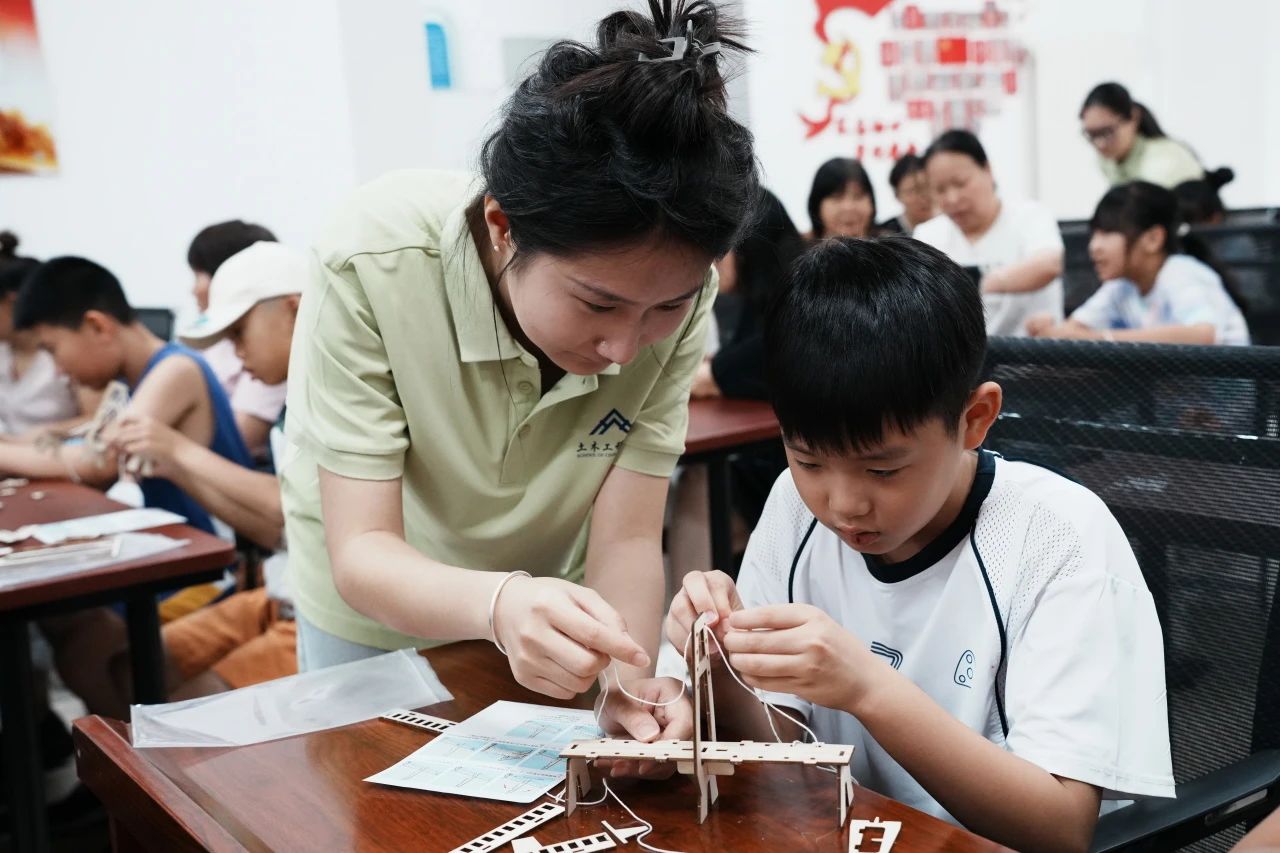“我的橋塔有點(diǎn)歪,需要加固!”“快,拉緊代表巴基斯坦的這根‘繩子’! ”活動現(xiàn)場,此起彼伏的稚嫩呼喊聲里透著十足的專注。正是在這動手操作和相互配合中,“共同受力”“協(xié)作支撐”這些抽象的概念,轉(zhuǎn)化成了他們指尖最真切的觸感與心中豁然開朗的理解。終于,當(dāng)?shù)谝蛔珊⒆觽冇H手完成的斜拉橋模型穩(wěn)穩(wěn)矗立時,成功的歡呼瞬間點(diǎn)燃了整個社區(qū)中心的熱情。