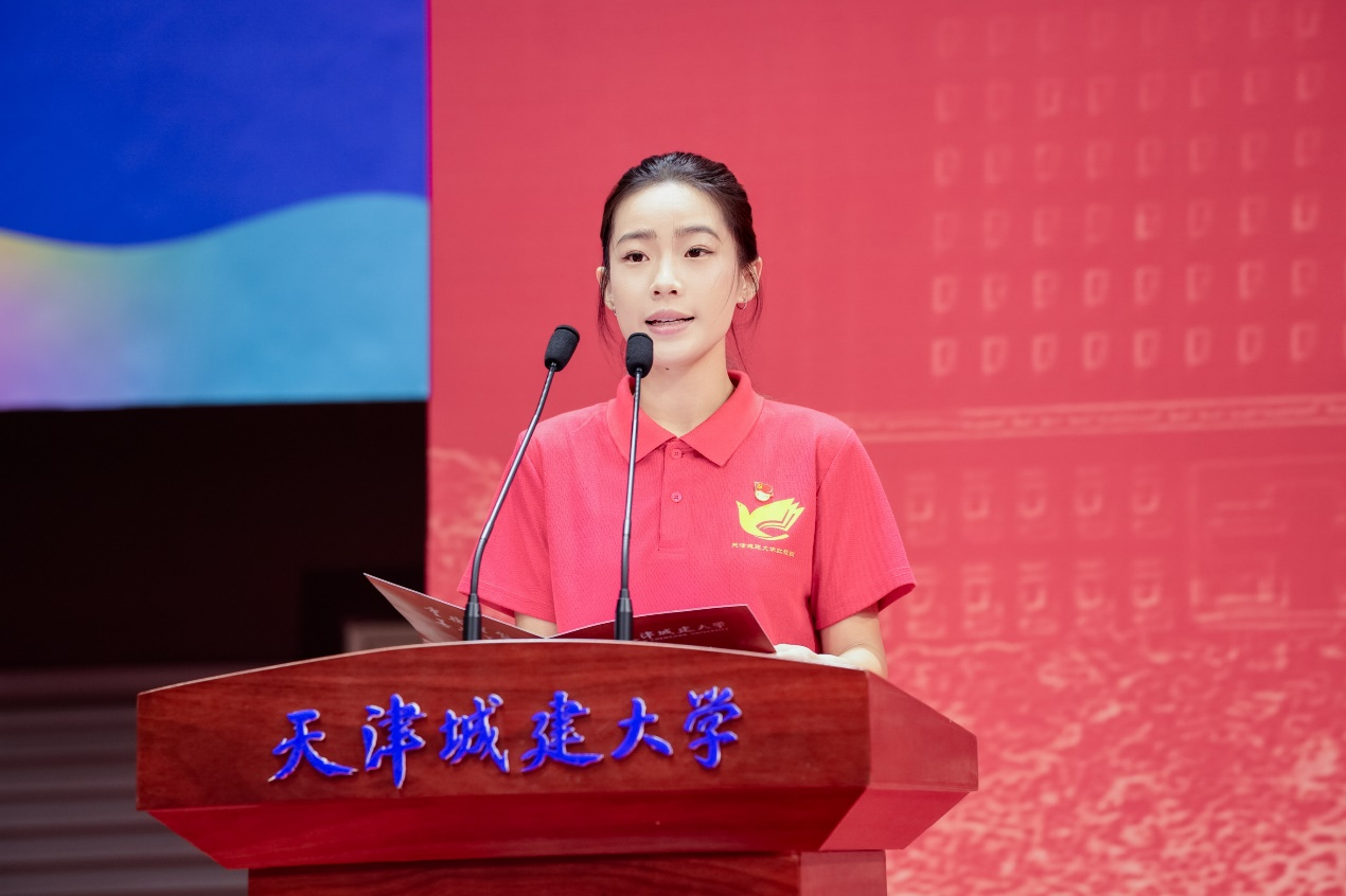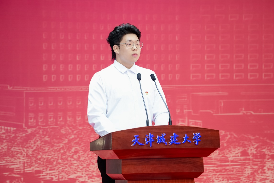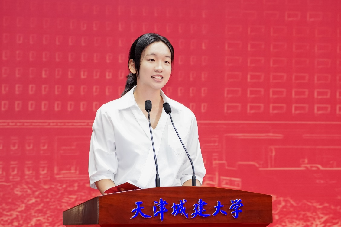 天津市青馬工程高校班學員、校“紅旗班”學員、計算機與信息工程學院2022級軟件工程專業本科生邢趙微同學作為在校本科生代表進行發言,她分享了自己把夢想寫進青春、把愛國寫進青春、把信仰寫進青春的成長故事,鼓勵同學們堅韌自我,勇于擔當,做與祖國同向同行的奮斗者。