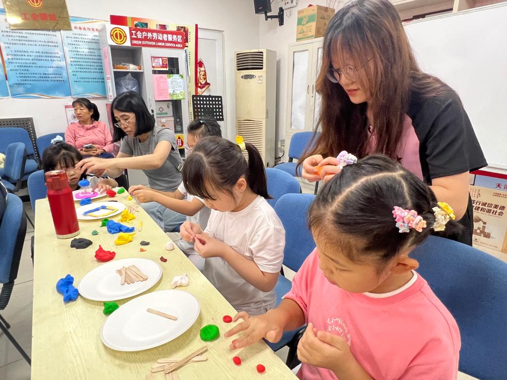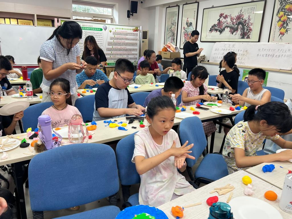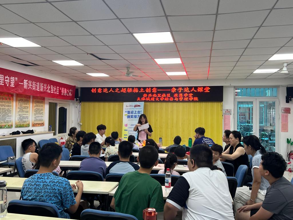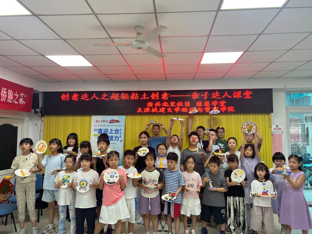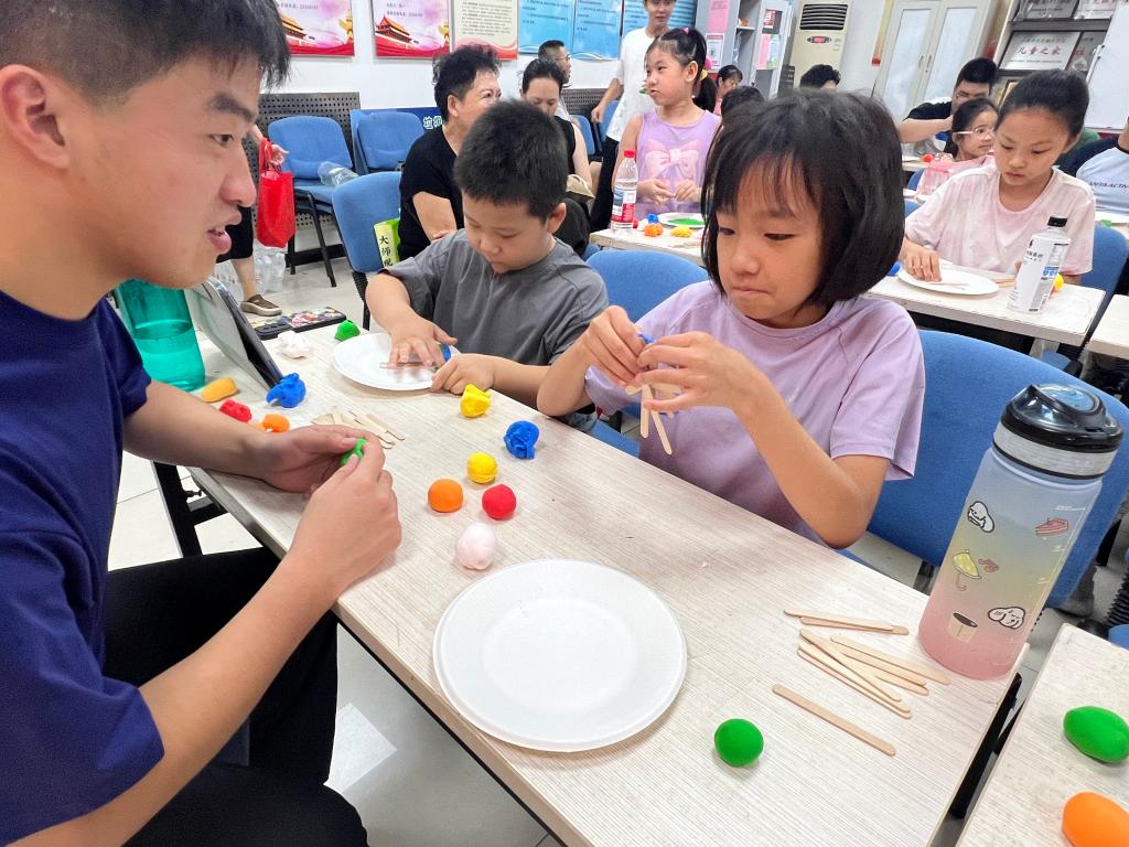 在新興北里社區,實踐團以天津地標建筑為創意載體,通過“科普講解+黏土手工”相結合的方式,帶領30余名中小學生邊玩邊學,感知天津特色建筑背后的科技內涵與城市文化。