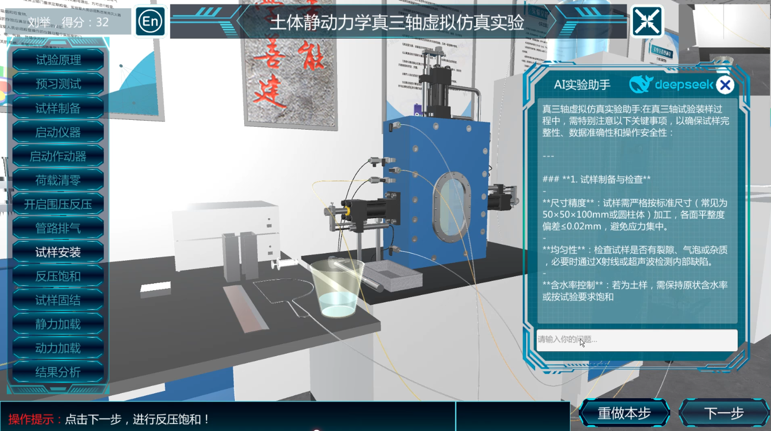 案例針對當前虛擬仿真實驗教學存在的三大瓶頸:⑴學生在自主操作實驗過程中,缺乏實時指導,導致部分實驗完成度較差;⑵傳統虛擬實驗系統僅提供標準化流程,阻礙學生對實驗機理的理解和實操能力的提升;⑶學生實驗數據處理能力薄弱。我校土木工程學院劉舉副教授團隊通過對學校自主研發的虛擬仿真實驗《地下結構抗震虛擬仿真實驗》(國家級)和《土體靜動力學真三軸虛擬仿真實驗》(省部級)兩門課程進行二次開發,將DeepSeek大模型與虛擬仿真實驗無縫對接,開發出“AI實驗助手”,為虛擬仿真實驗教學帶來革命性升級。“AI實驗助手”核心能力體現在三個方面:首先,可以跨時空給虛擬仿真實驗提供實時的實驗指導,有效提升實驗完成率;其次,加深學生對實驗步驟和實驗機理的理解,提高學生的實操能力和復雜實驗參數的設置能力;最后,提升了學生對實驗數據處理和分析能力。通過“AI實驗助手”賦能虛擬仿真實驗構建出“操作效率大幅提高-分析深度有效增強-解決問題能力顯著提升-充分彰顯實驗個性化”的實驗能力培養閉環,為人工智能+虛擬仿真實驗教學改革提供新的解決方案,助推虛擬仿真實驗建設登上新臺階。