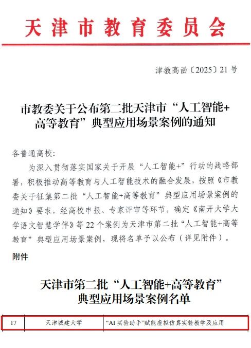 近日,在天津市教委公布的第二批天津市“人工智能 + 高等教育”典型應用場景案例認定名單中,我校土木工程學院劉舉副教授主持的《“AI 實驗助手”賦能虛擬仿真實驗教學及應用》成功獲批。截至目前,我校已有3個案例入選市級“人工智能 + 高等教育”典型應用場景案例,充分彰顯了學校在教育數字化轉型領域的顯著成效。