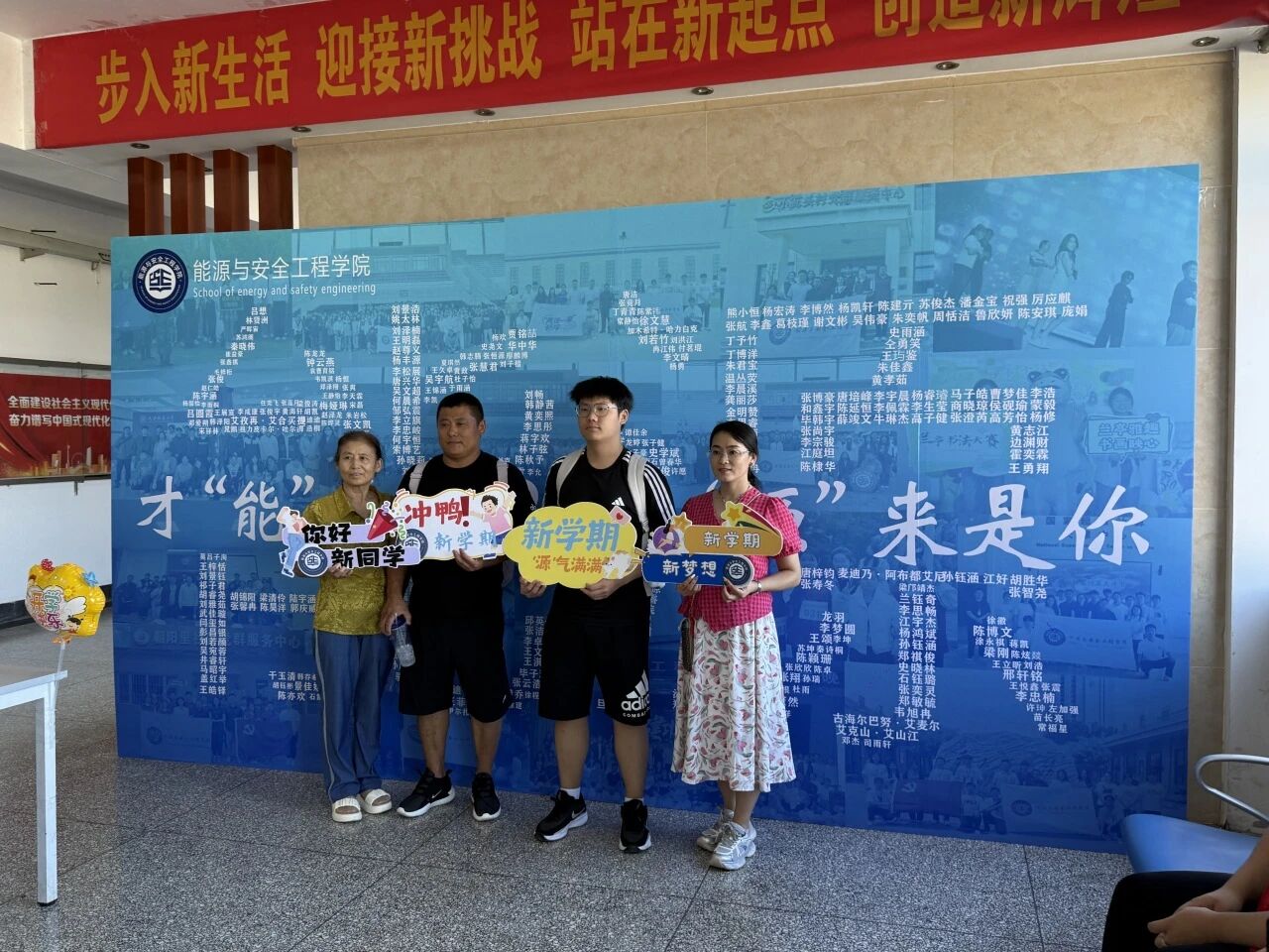 新生與家長(zhǎng)們?cè)诒尘皦η榜v足