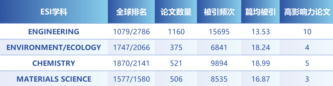 根據總被引頻次最新數據,學校總體ESI國際排名較去年同期上升了232位,目前已進入ESI前1%的4個學科具體表現如下: