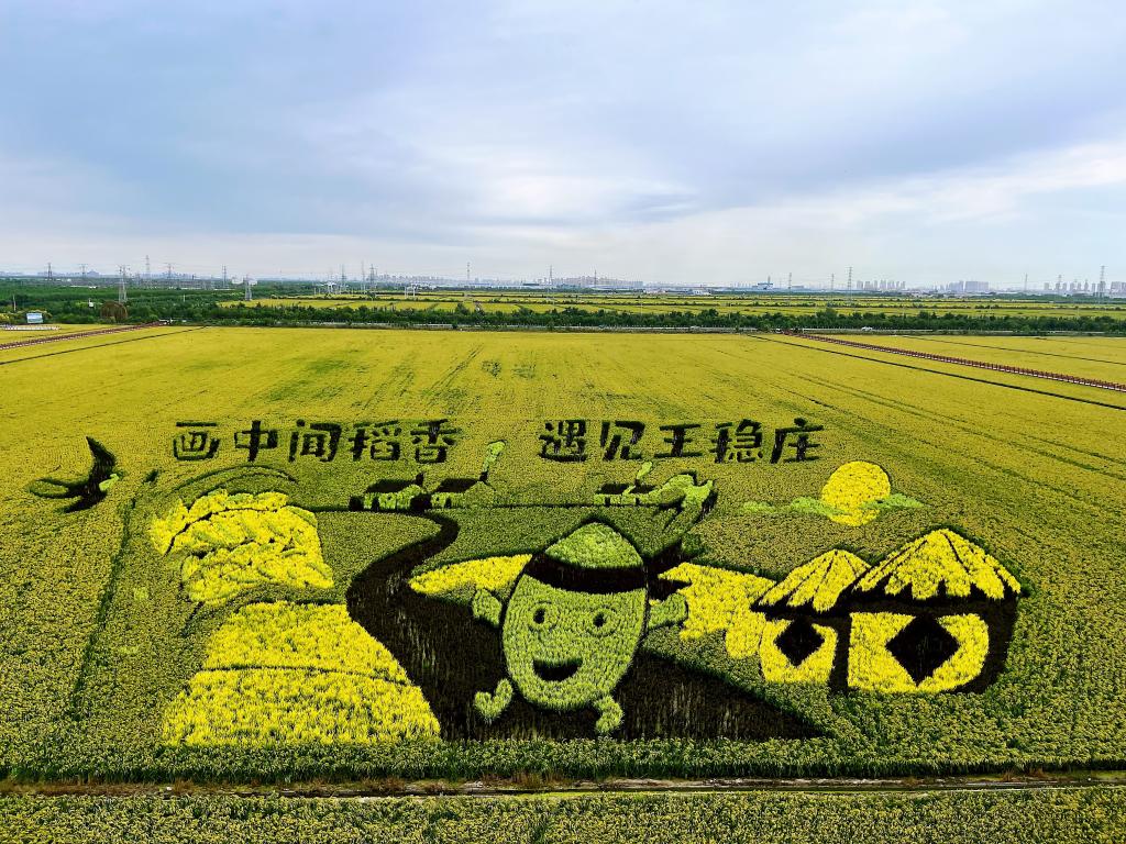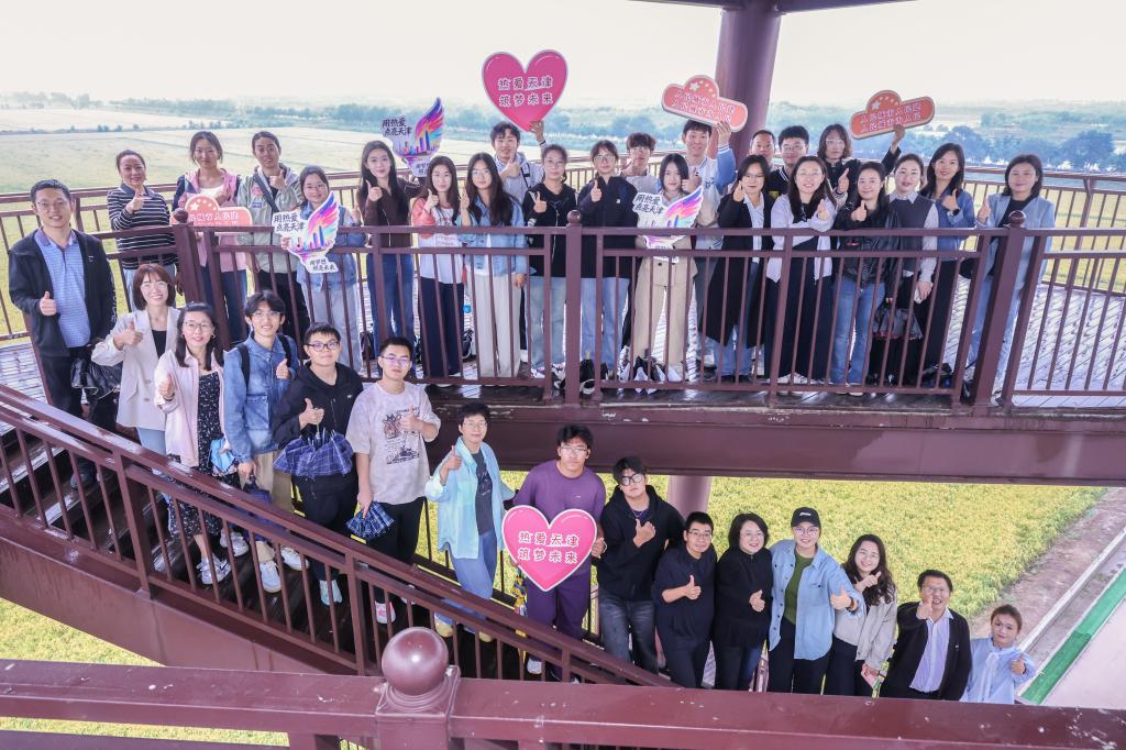 隨后,師生們一行在工作人員的引導(dǎo)下登上豐收塔俯瞰稻田畫。極目遠眺,由不同色彩的水稻“繪制”而成的巨幅畫卷在田間震撼鋪展,色彩錯落間生動勾勒出鄉(xiāng)村振興的美好圖景。