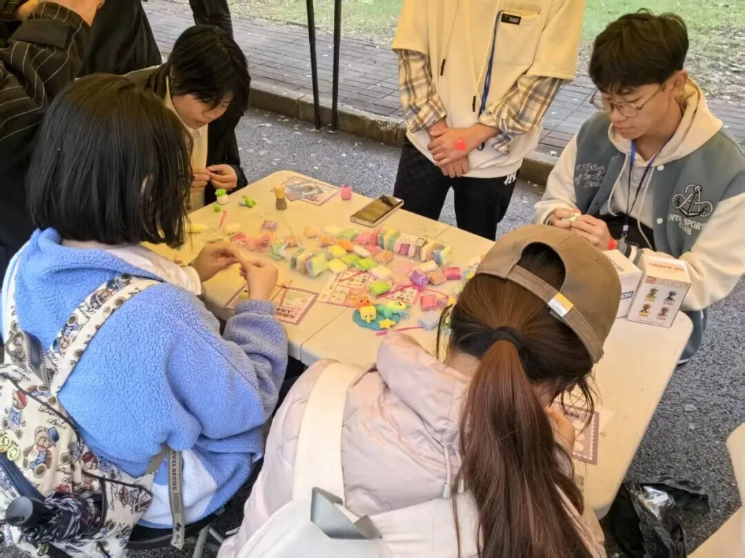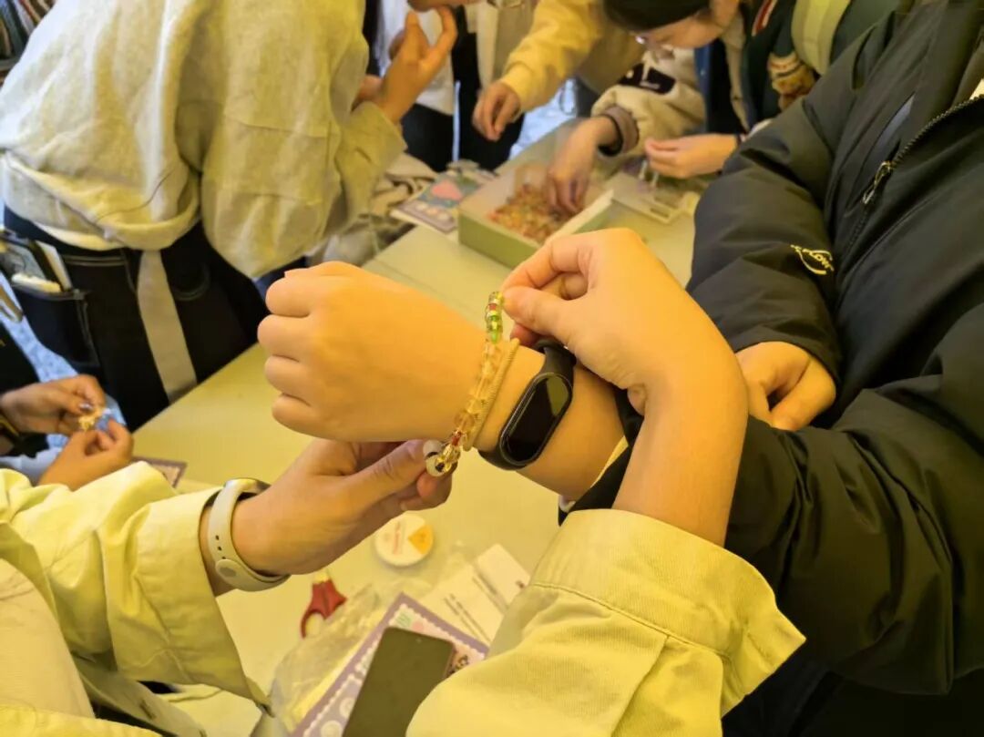 “手作療愈,知行合一”的“勞心”區域讓學生們在動手實踐中收獲滿滿。拼個迷你“微景觀生態瓶”、嘗試用“減壓粘土”做小擺件,學編小手鏈,在一針一線中體驗傳統手工藝的寧靜與耐心。