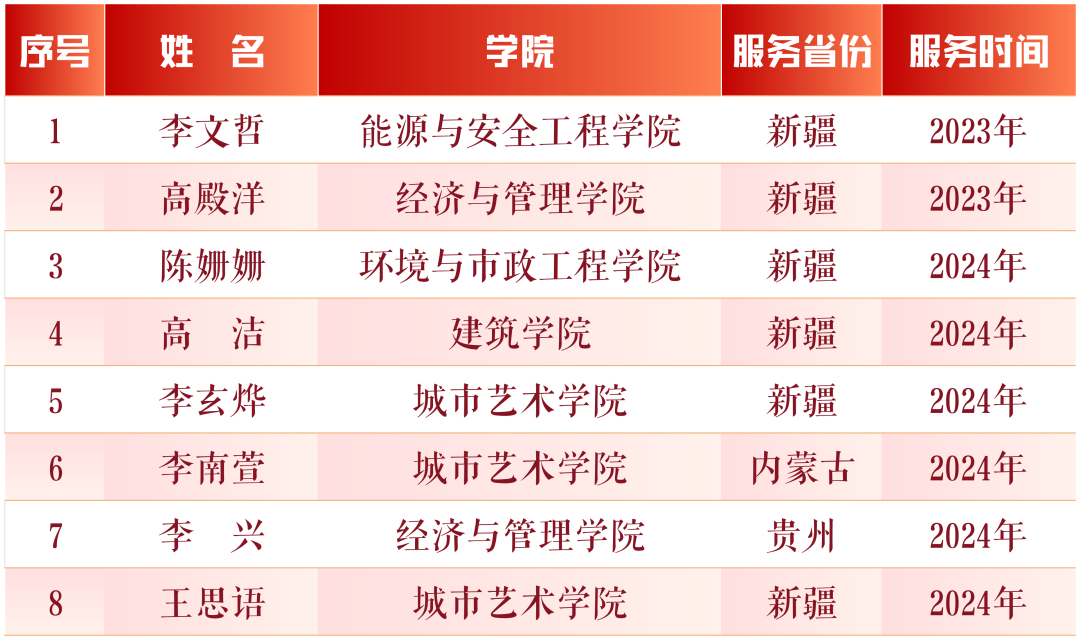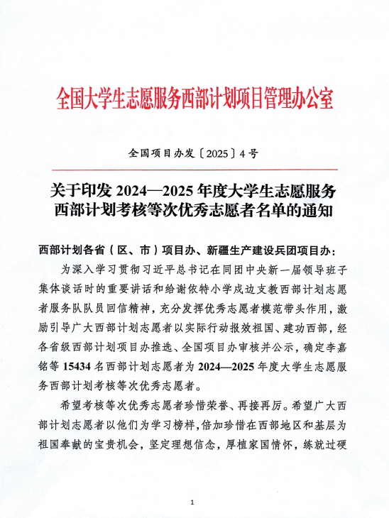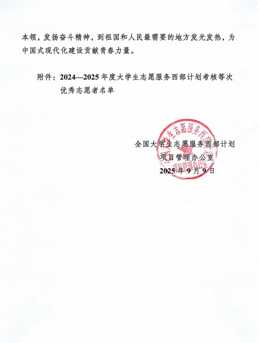 回首征程,每一寸足跡都浸潤著組織的關懷與扶持;眺望前方,熾熱的理想如胡楊般扎根邊疆沃土。西部計劃不僅是青春的試金石,更是新時代青年與祖國同頻共振的莊嚴承諾。一直以來,學校高度重視西部計劃工作,至今已有近100名大學生志愿者奔赴祖國中西部地區,為當地經濟社會發展貢獻青春力量。今后學校將持續加大志愿者招募選拔培養力度,深化大學生就業引航,引導青年學生共同繪就鄉村振興的壯美畫卷,讓青春之花在祖國最需要的地方絢麗綻放。