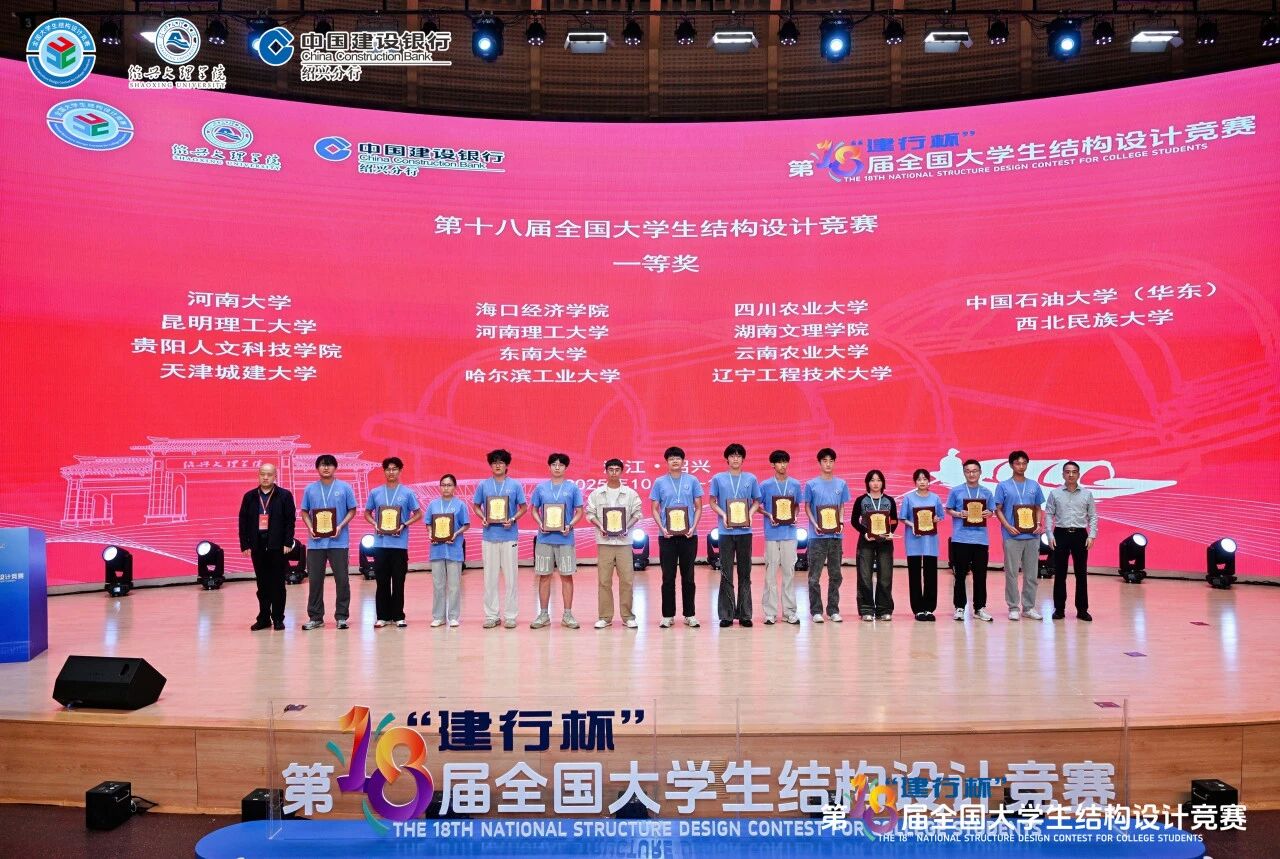 近日,在浙江紹興舉辦的“建行杯”第十八屆全國大學生結構設計競賽落下帷幕。我校土木工程學院崔金濤副教授、劉中憲教授指導,楊長燁、曲思翰、馬淵三名同學組成的參賽團隊以卓越的表現,在清華大學、浙江大學、同濟大學等全國121所高校的頂尖隊伍中突出重圍,斬獲全國一等獎,為學校贏得榮譽,再次彰顯出我校在土木工程領域的教學創新與人才培養成效。