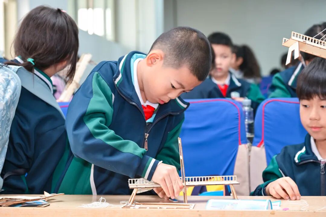 報告結(jié)束后,橋梁設(shè)計師實踐環(huán)節(jié)正式啟動。孩子們分組圍坐,手持斜拉橋模型構(gòu)件,從解讀圖紙到拼接零件,時而為如何固定橋塔爭論,時而為成功安裝繩索擊掌。短短40分鐘,一座座迷你斜拉橋在課桌上“挺立”。孩子們捧著自己的作品,臉上滿是成就感:“我要給家鄉(xiāng)建一座最安全的橋!”稚嫩的話語里,藏著對未來的憧憬,更藏著建設(shè)祖國的初心。