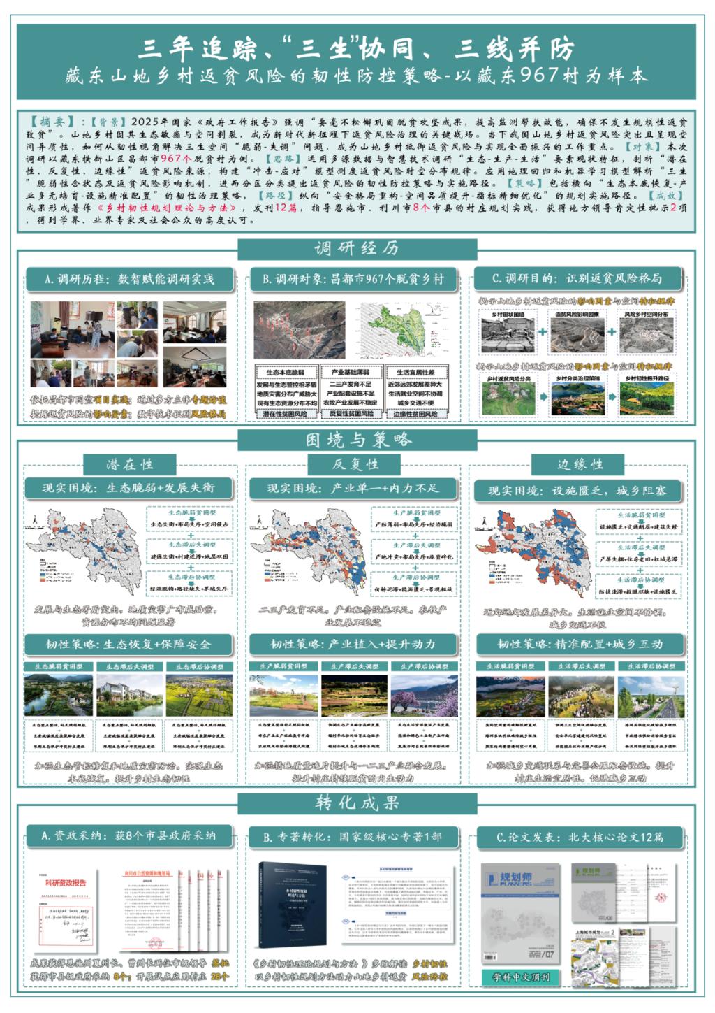 2025年國家《政府工作報告》提出要鞏固脫貧成果、防止規模性返貧。山地鄉村生態與區位脆弱,返貧風險突出且存在空間差異。研究以西藏昌都967個脫貧村為例,運用多源數據與智慧技術,分析“三生”空間特征及返貧風險來源,構建“沖擊-應對”模型測度風險分布,并通過地理加權回歸與機器學習解析影響機制。研究提出橫向“生態-產業-設施”系統治理與縱向“安全-品質-指標”規劃路徑相結合的韌性防控策略。成果形成專著1部、論文12篇,指導多地規劃實踐,獲多項獎項與批示,受到廣泛認可。