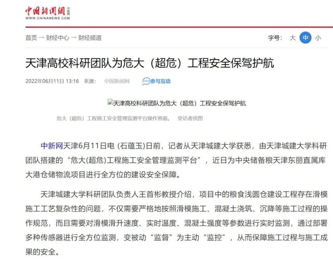 6月11日,中國新聞網以“天津高校科研團隊為危大(超危)工程安全保駕護航”為題,對我校王首彬科研團隊相關工作進行報道,原文如下。