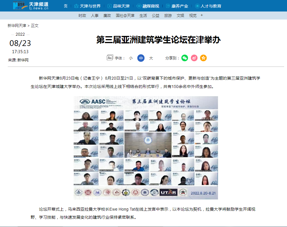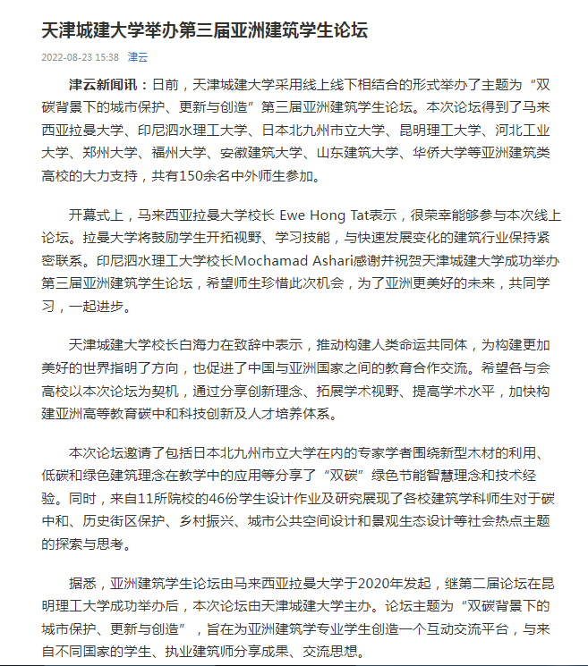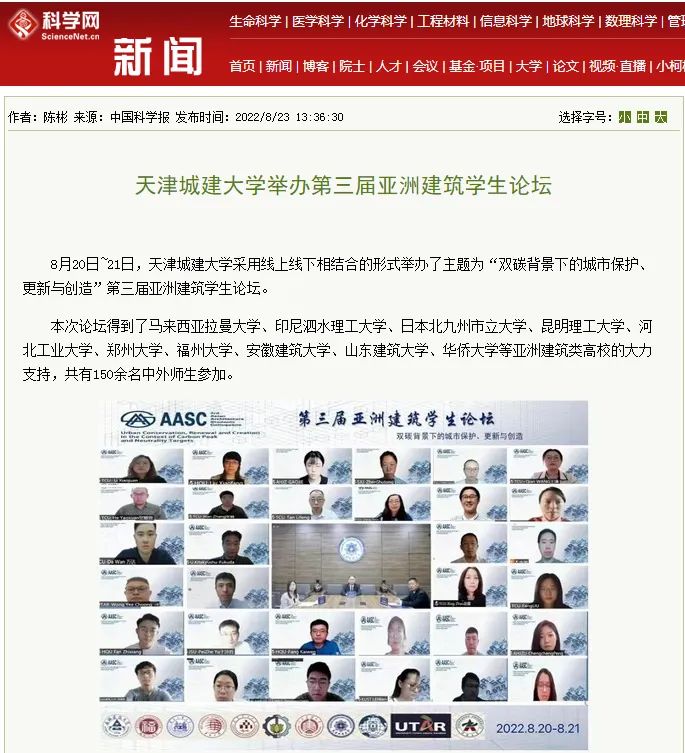 為做好此次大會的宣傳報道工作,黨委宣傳部協同國際交流處、建筑學院自今年7月底開始就對論壇的內外宣傳工作進行策劃,從會議預告、會議回溯、學校服務國家“雙碳”戰略方面所開展的工作到會議開幕式、主旨演講、優秀學生作業展示等進行了認真地籌劃,力求做到全方位展示。此外,黨委宣傳部積極與中央和我市相關媒體進行對接,實現在報道大會實況同時,積極展現學校在教育教學、學科建設、國際交流等方面所取得的工作成效。新華網、中國日報中文網、中國新聞網、科技日報、科學網、津云等中央和我市媒體對大會的成功舉辦給予了關注并進行報道。同時,為進一步加強對學校內涵建設宣傳,黨委宣傳部今年以來積極與科技日報、科學網等央級科技類媒體進行對接,以更好展示學校在教育教學、學科科研等內涵建設上的成效。