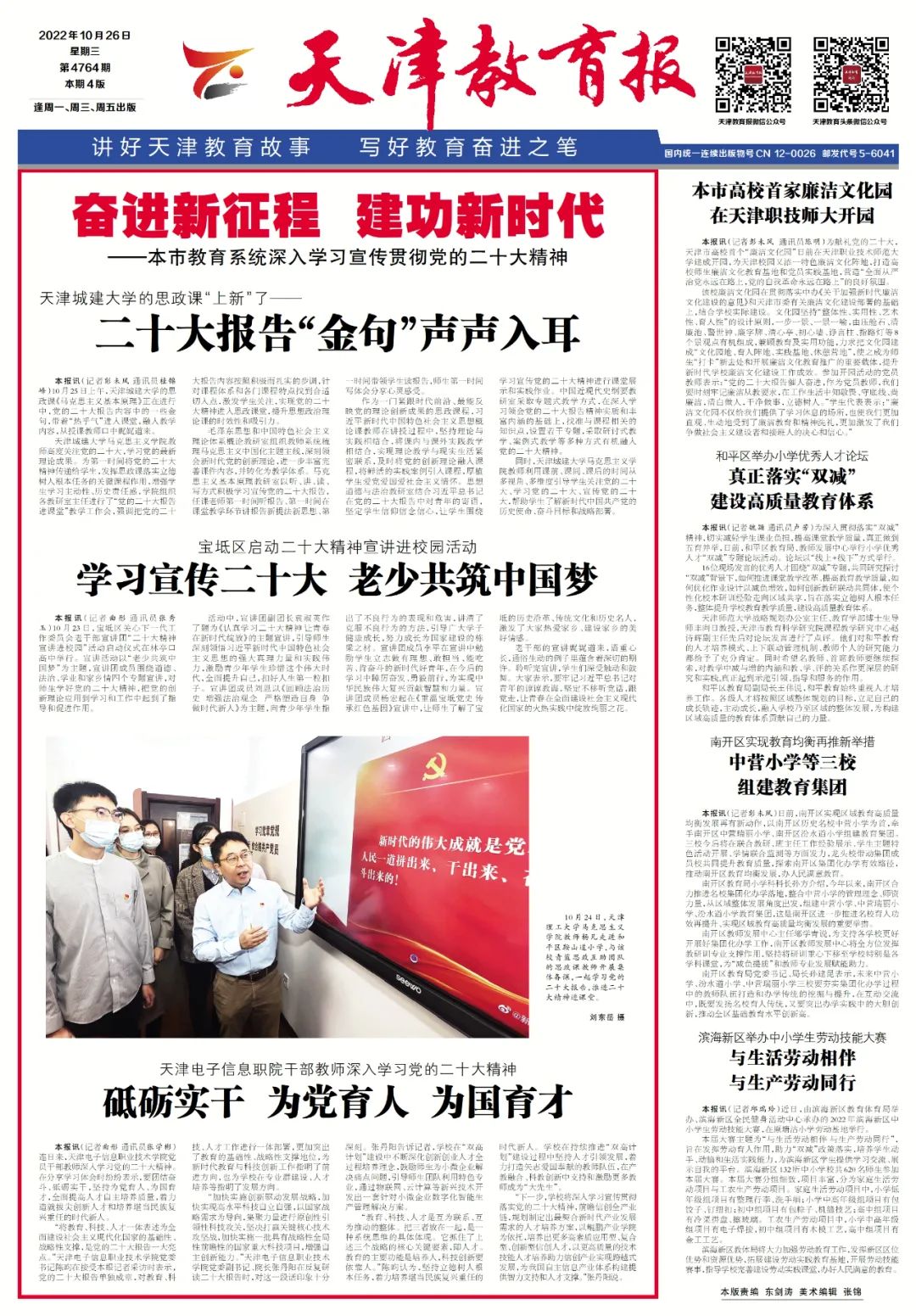 10月26日出版的《天津教育報》以“天津城建大學的思政課‘上新’了——二十大報告‘金句’聲聲入耳”為題對我校學習宣傳貫徹黨的二十大精神進行報道。原文如下。