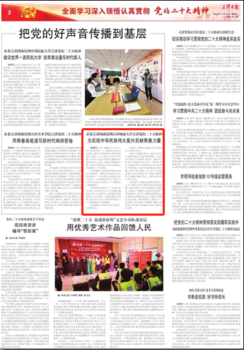 11月19日出版的《天津日?qǐng)?bào)》以“把黨的好聲音傳播到基層 市委宣講團(tuán)成員到天津城建大學(xué)宣講黨的二十大精神 為實(shí)現(xiàn)中華民族偉大復(fù)興貢獻(xiàn)青春力量”為題對(duì)學(xué)習(xí)貫徹黨的二十大精神市委宣講團(tuán)成員、副市長(zhǎng)李樹(shù)起和市委宣講團(tuán)成員、黨的二十大代表、和平區(qū)岳陽(yáng)道小學(xué)校長(zhǎng)、黨總支副書(shū)記褚新紅組成的宣講小分隊(duì)來(lái)我校進(jìn)行黨的二十大精神宣講進(jìn)行了報(bào)道,原文如下: