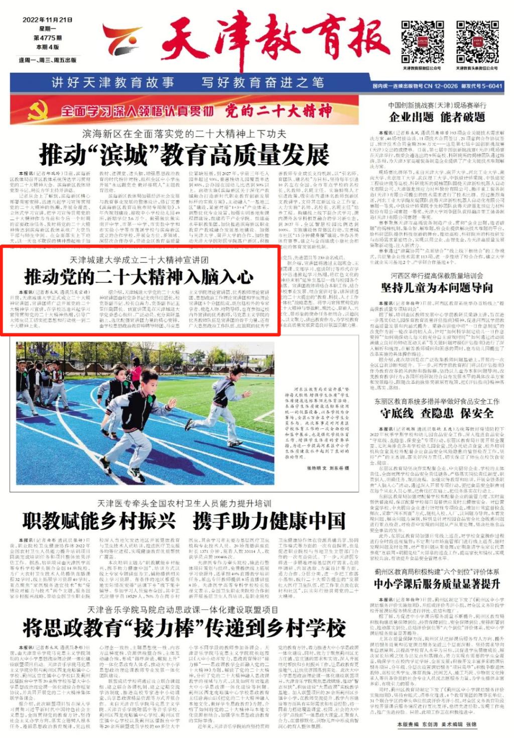 11月21日出版的《天津教育報》以“天津城建大學成立二十大精神宣講團 推動黨的二十大精神入腦入心”為題對我校學習宣傳貫徹黨的二十大精神進行報道,原文如下: