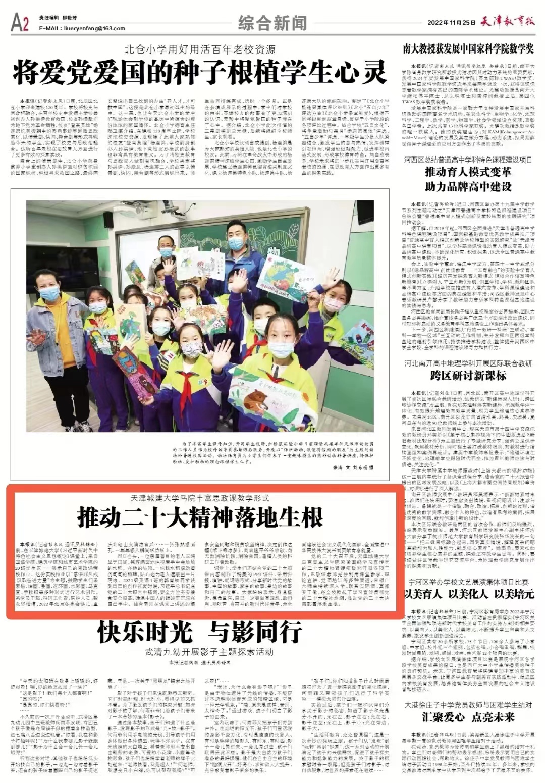 11月25日出版的《天津教育報》以“天津城建大學馬院豐富思政課教學形式推動二十大精神落地生根”為題,對我校馬克思主義學院豐富教學形式進行了報道,原文如下: